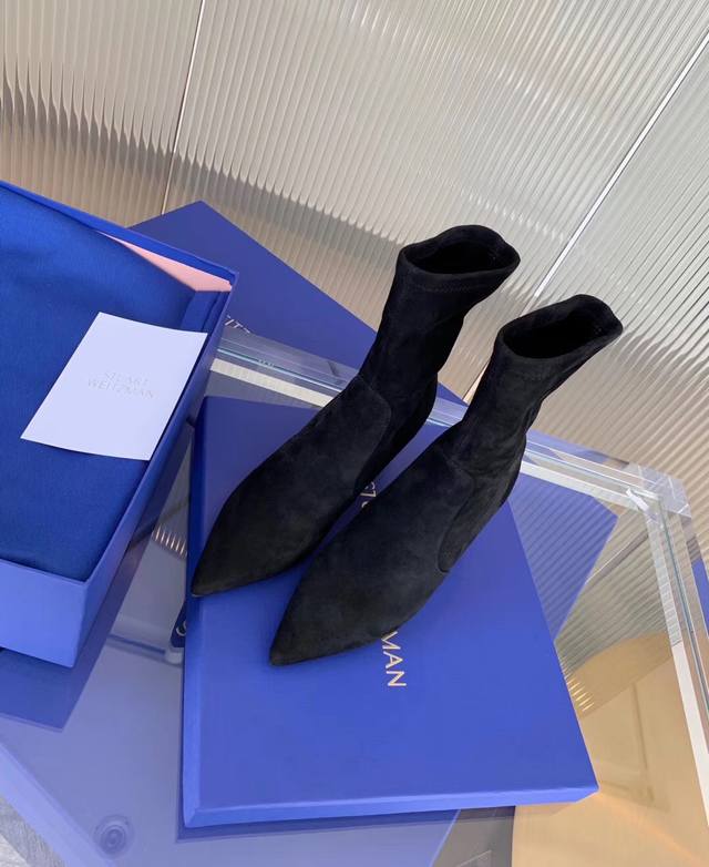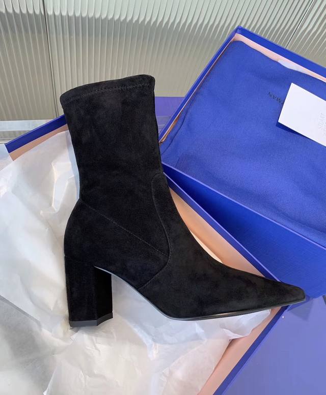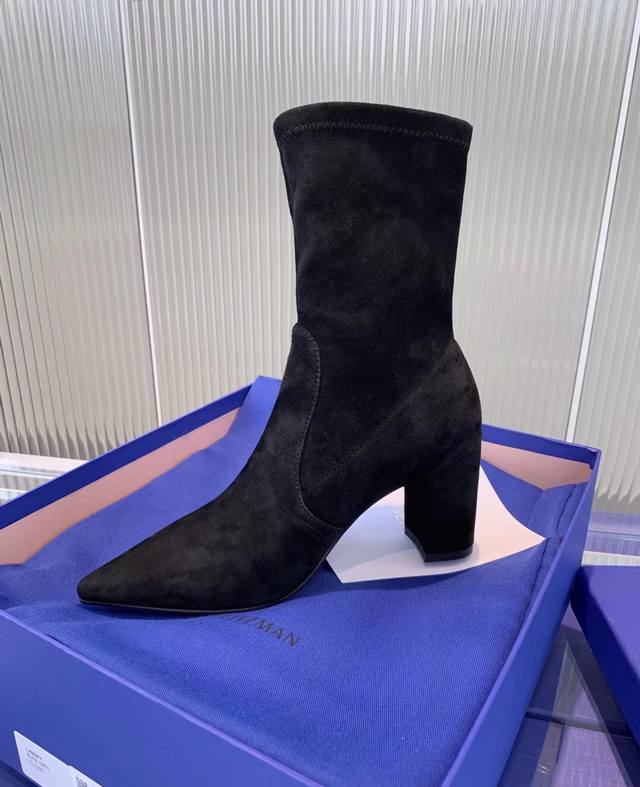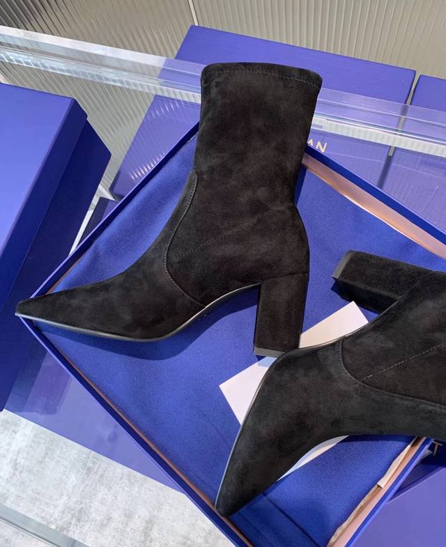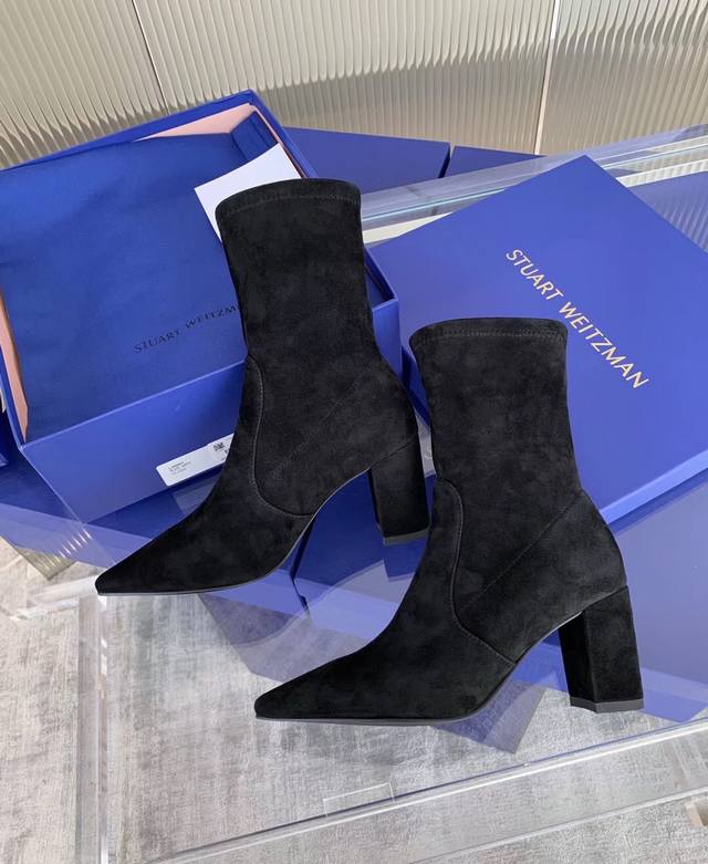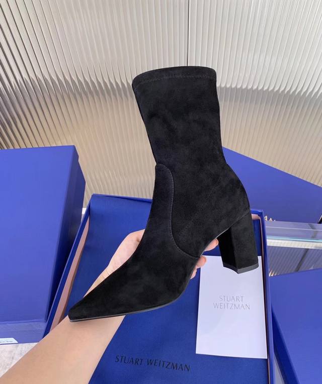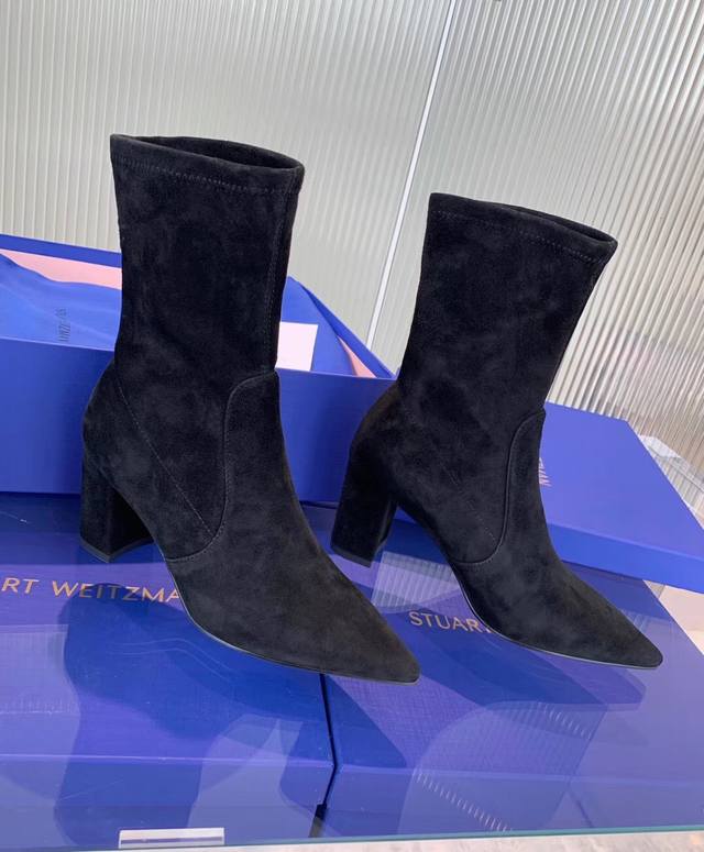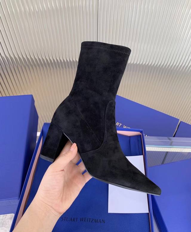 Sw 跟高7Cm 肯豆海报款尖头粗跟弹力短靴 上脚气场全开 面料,弹力羊绒 内里:猪皮内里+进口弹力莱卡 大底:橡胶耐磨大底 码数:34-42