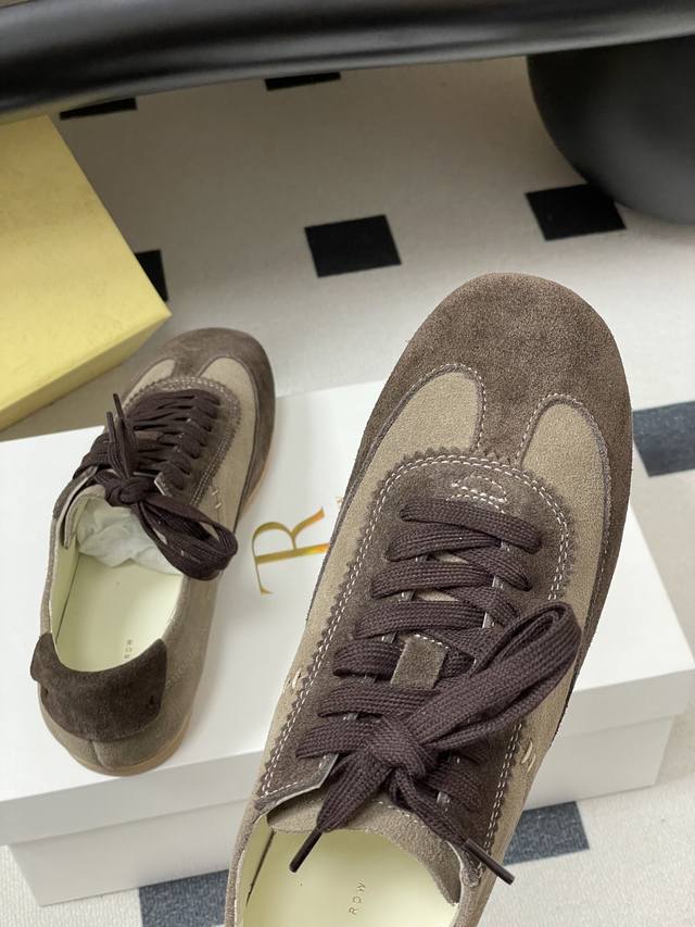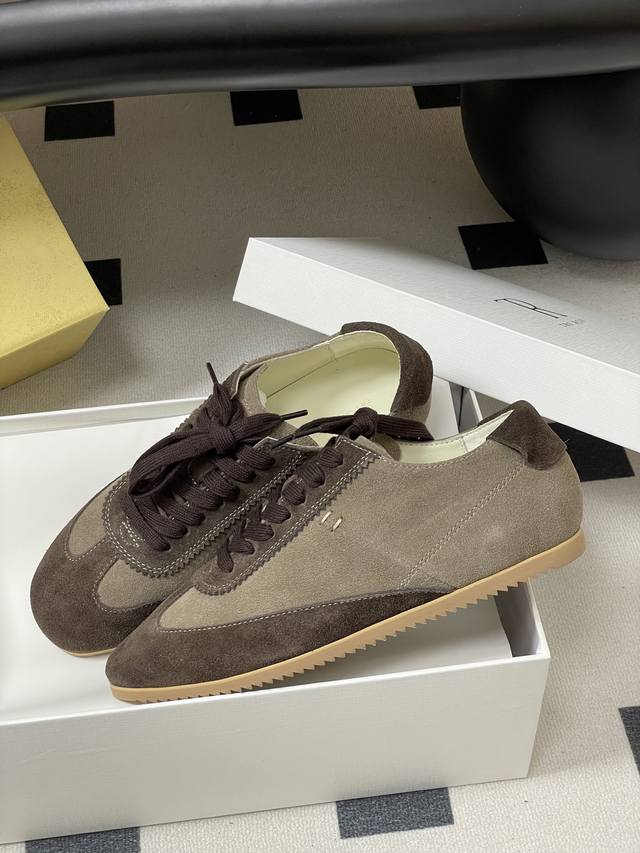 The Row 26S春夏新款 Tr极简主义拼色系带休闲鞋阿甘德训鞋 这款低帮运动鞋是打造极简主义休闲夏日衣橱的理想穿搭之选,采用麂皮鞋面和同色系橡胶鞋底设计,