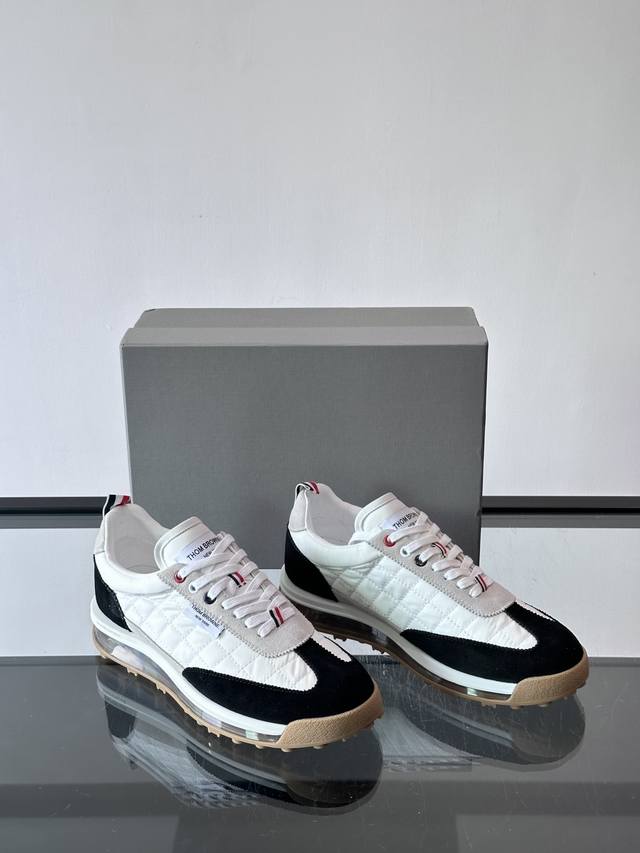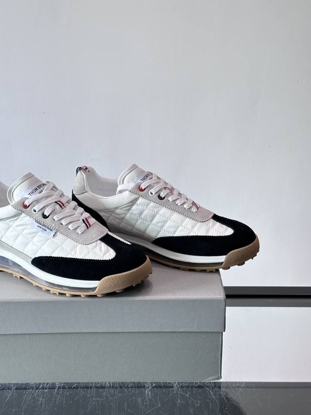 / Thom Browne男士气垫休闲鞋,麂皮+网布拼接,质感细腻又透气。标志性红白蓝鞋带,辨识度超高。透明气垫鞋底,缓震舒适,日常或轻运动都Ok!鞋舌品牌标签,细