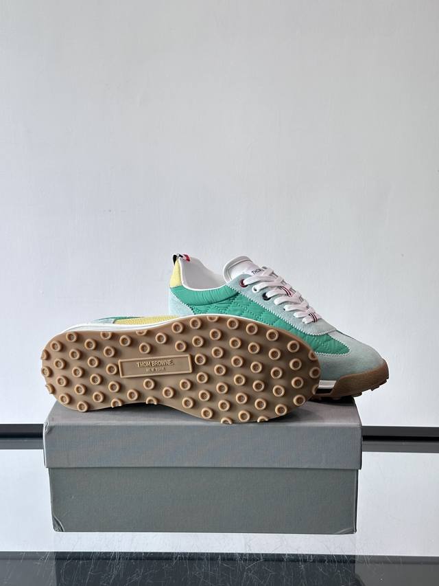 Thom Browne 男士气垫休闲鞋,麂皮+牛皮拼接,质感细腻又透气。标志性红白蓝鞋带,辨识度超高。透明气垫鞋底,缓震舒适,日常或轻运动都Ok!鞋舌品牌标签,