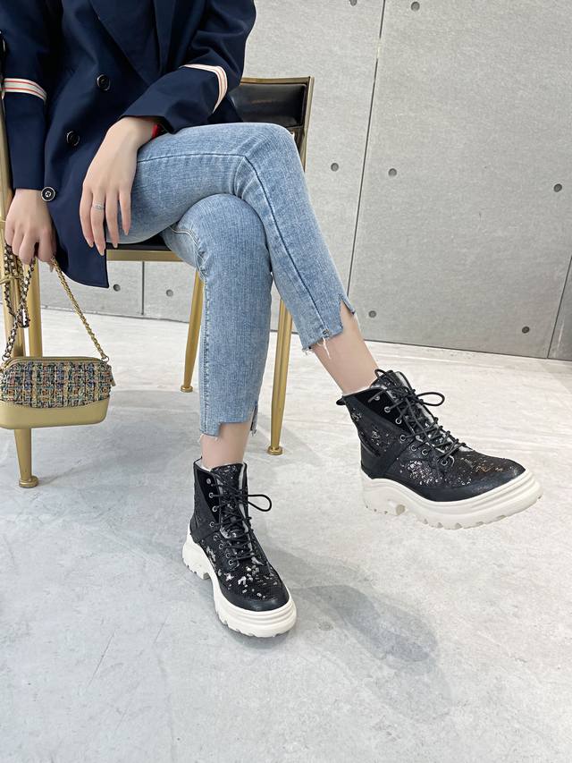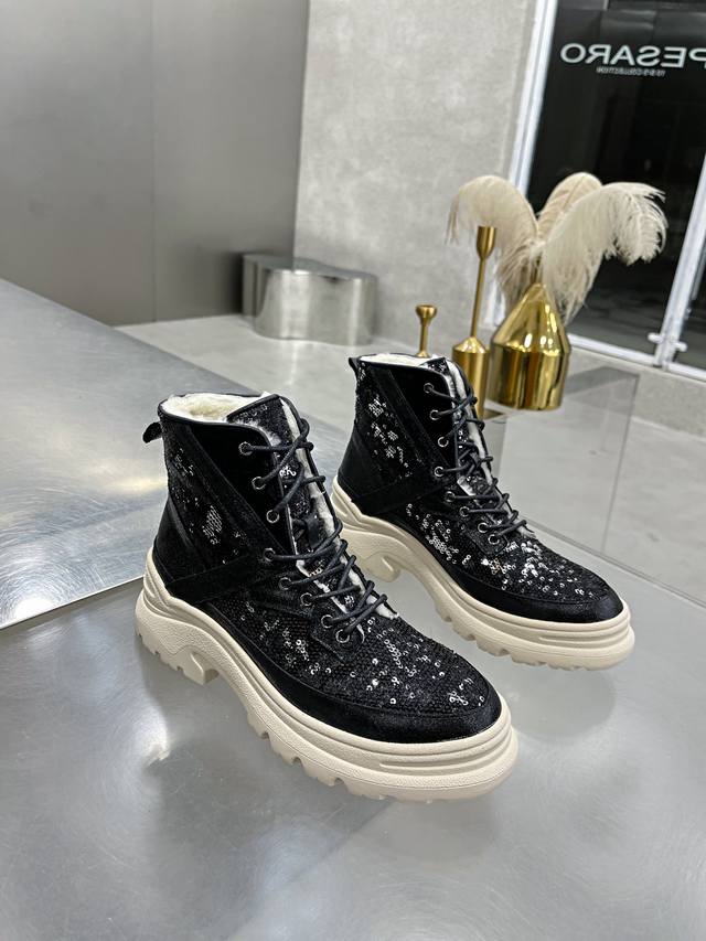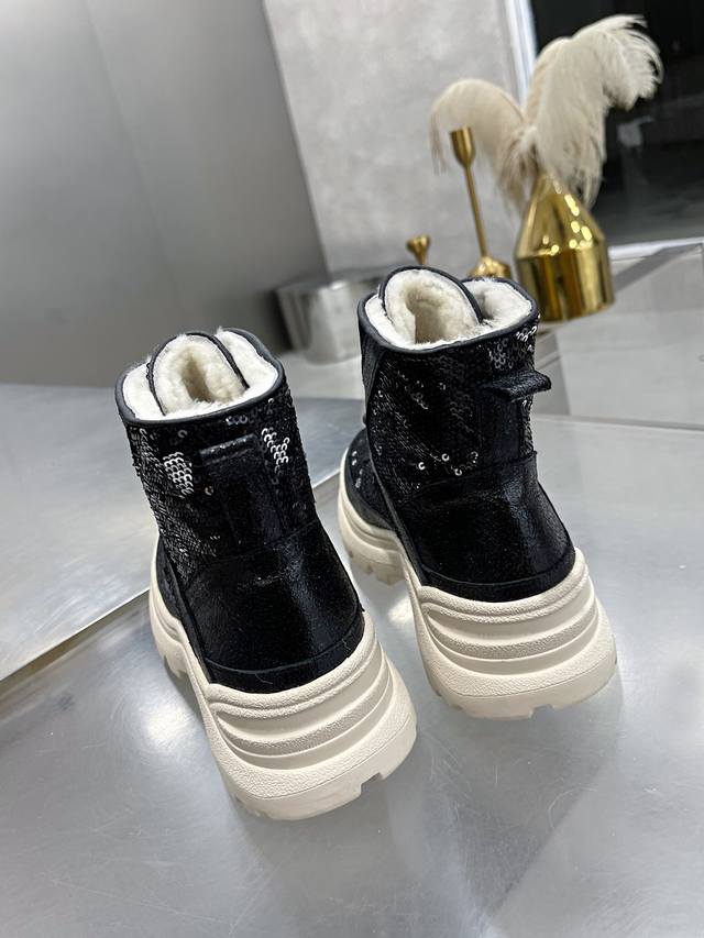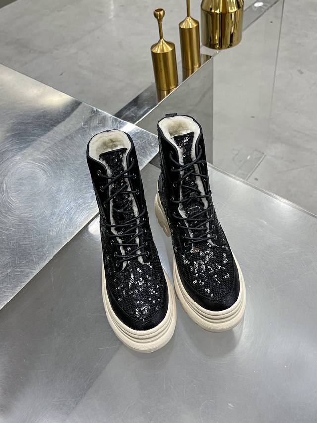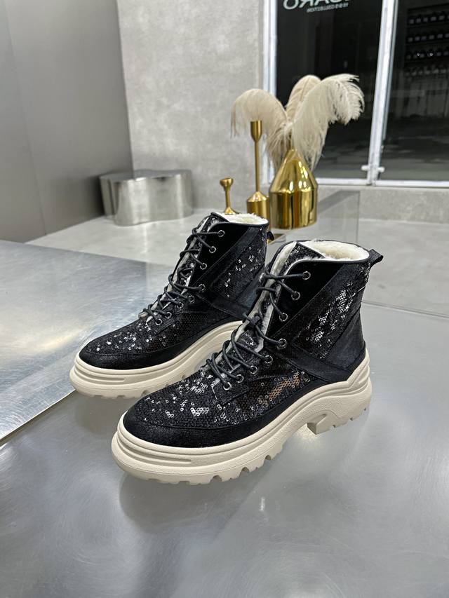 Ugg新款雪地靴;拒绝臃肿,原版头层全粒面防水牛皮+澳洲皮毛一体,内里澳洲羊皮毛一体,系带一脚蹬方便穿脱,冬季必备的一款毛靴, 请不要拿那些内里做半截假毛的来对比;没有对比就没有伤害;好东西带给美女们更好的享受 特 货号:01 材质:全粒面防水小牛皮+绣花亮片工艺+澳洲羊毛一体内里 颜色: 黑色、银色 码数:34-41 跟高:3.5Cm生胶耐磨大底超级耐磨 隔绝冬季寒冷