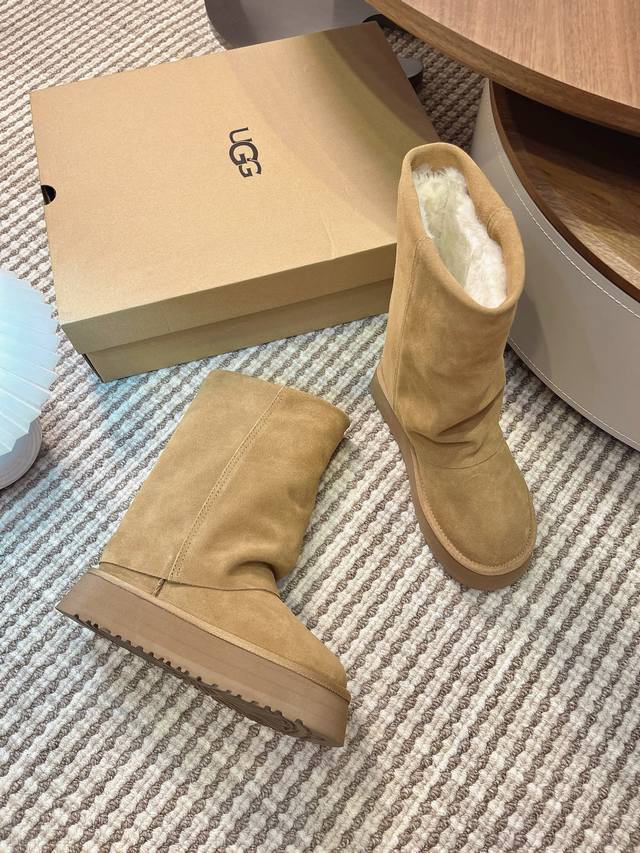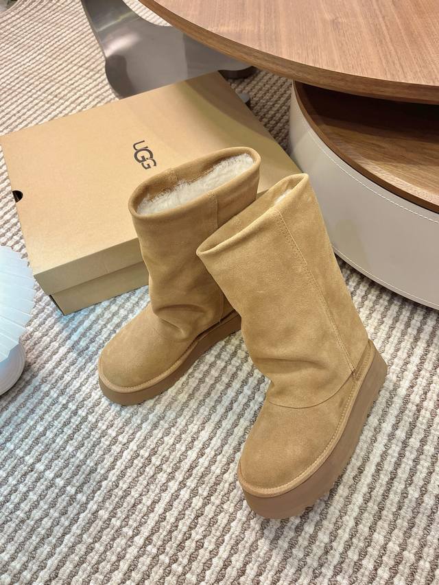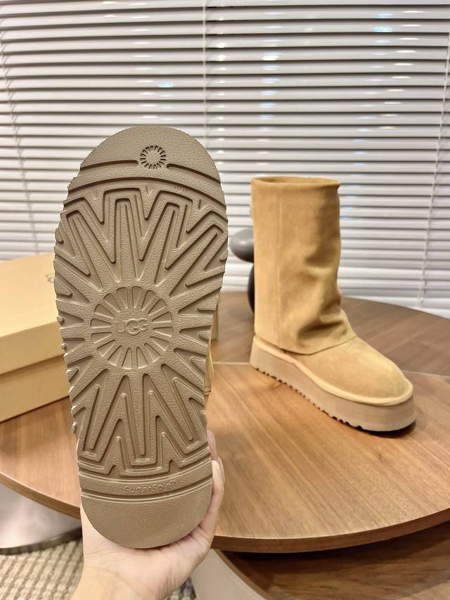 Ugg 女款Size :35-40,可订41 Ugg宁艺卓同款厚底雪地靴 时尚与保暖完美融合,靴筒折叠牛皮,内里全羊毛,组合大底,增高又显时尚,中低两个高度可选