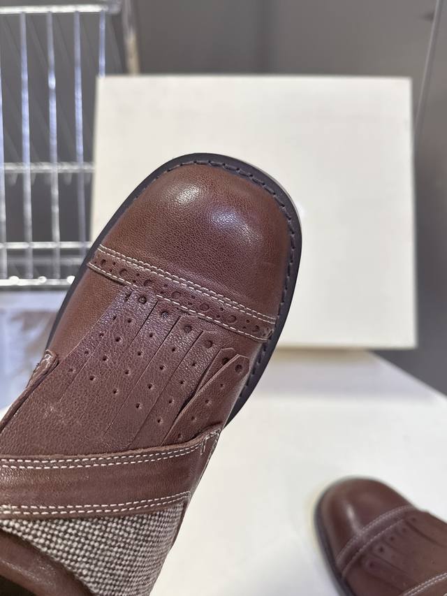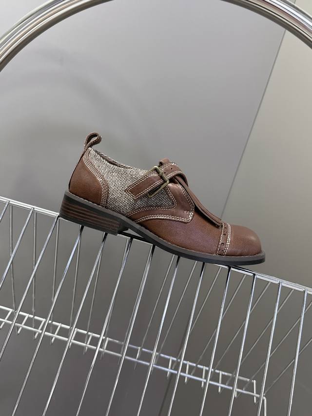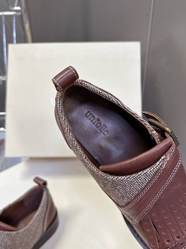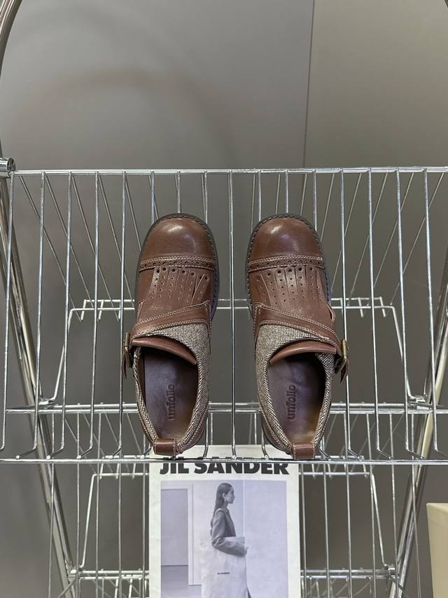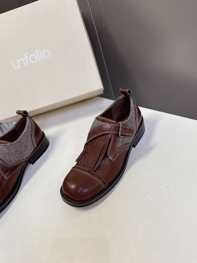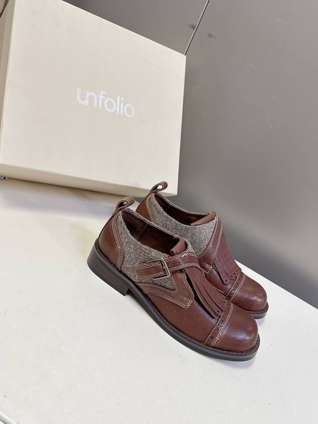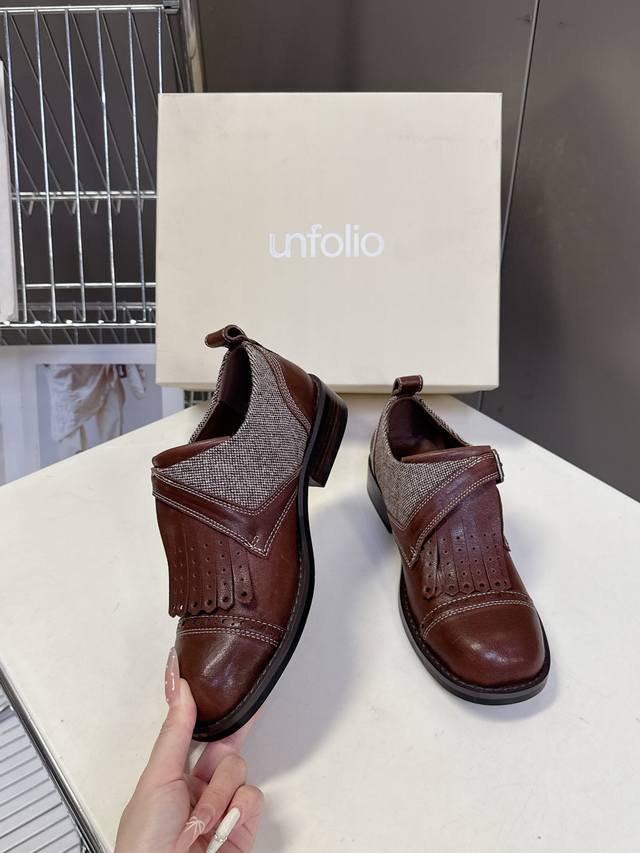Unfolio小众品牌最新款Eloise 孟克鞋乐福鞋 甄选自然纹理牛皮与温暖毛呢织物,精妙拼接诠释复古质感。承袭孟克皮鞋标志性单搭扣、流苏、手工打孔雕花细节,精髓更见于皮质沿条饰边与真皮包覆鞋跟的匠心工艺。深邃红棕古铜色调,沉淀浓郁Vintage气息,演绎现代非正式学院风的摩登叙事面料:进口小牛皮 内里:水染牛皮 鞋底:原版开模防滑大底 Size:35-40 40定制不退不换