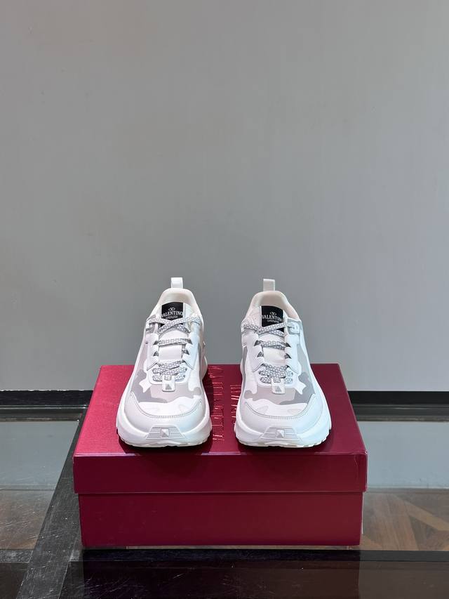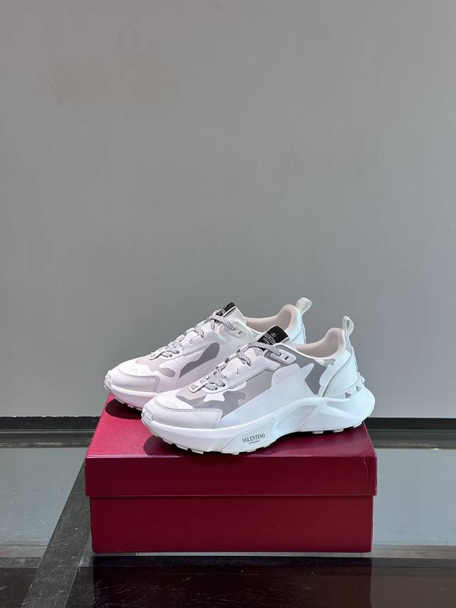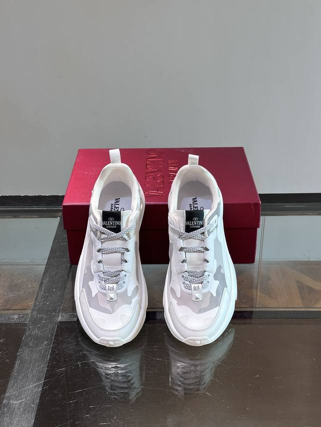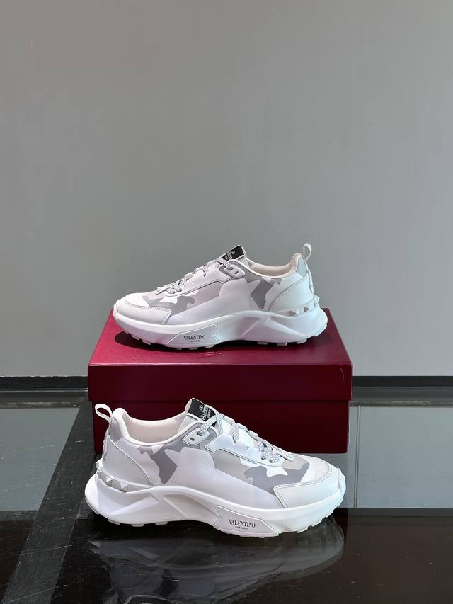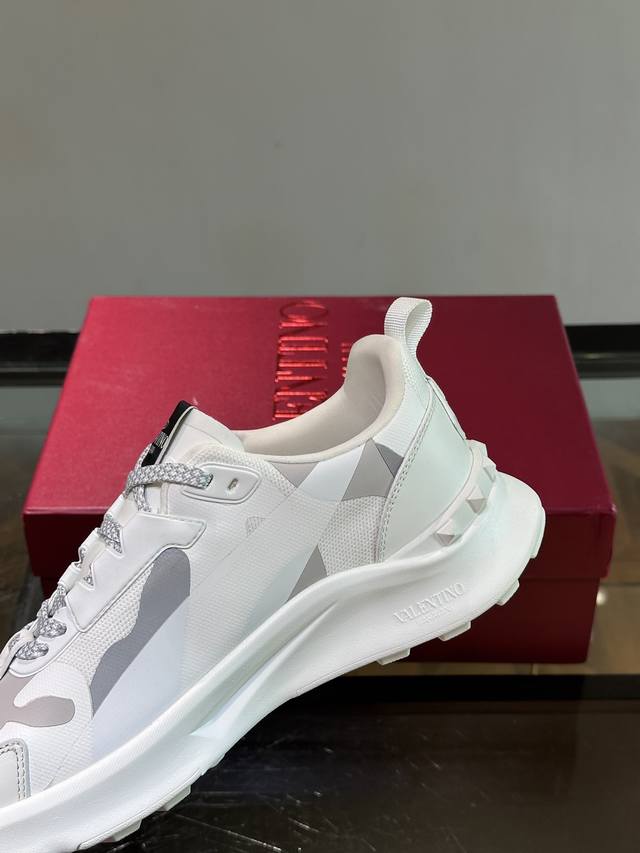 / Valentin*华伦男士休闲运动鞋,采用多材质拼接,超轻运动鞋,小牛皮拼接迷彩织布鞋面,织物鞋舌饰有品牌徽章,后跟橡胶铆钉装饰细节,铆钉橡胶大底,防滑耐磨减震