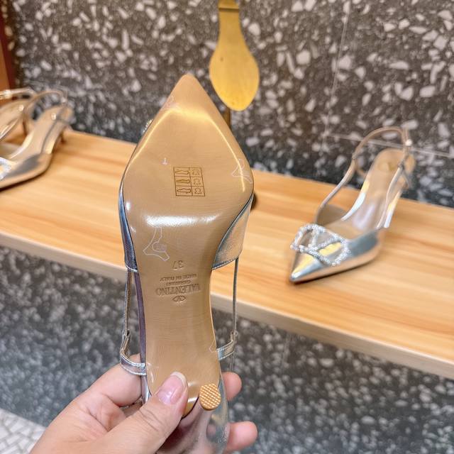 Valentin* 华伦大V扣凉鞋,专柜最新系列 最高版本 V家这次出的水钻系列可以说是非常火爆了 抛弃了一贯的铆钉元素 化繁为简 更加精致耐看按正品1:1复制 上脚非常修脚型 重点是很好非常好驾驭 不磨脚不累脚 行走神器,楦型完全对比专柜 细节完美 没有原版是做不出这样精致! 注!鞋跟型及高度是按原版独家开模具,不是市场随意代替 扣件颜色与质感与原版一致,注意真皮大底也按照原版做出木纹条状 DDD 码数35-39 34、40、41、42码不退不换 DDD 跟高:7.5Cm 4.5Cm DDD