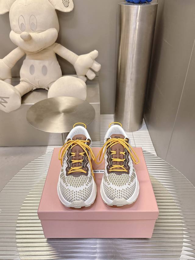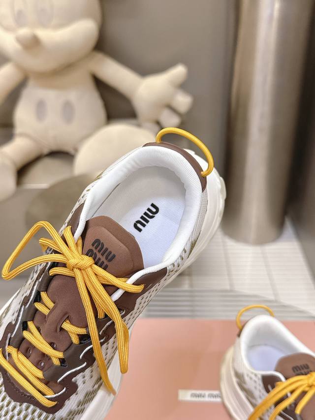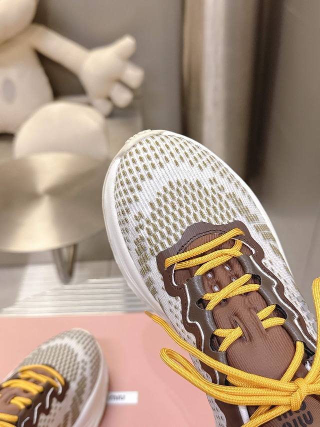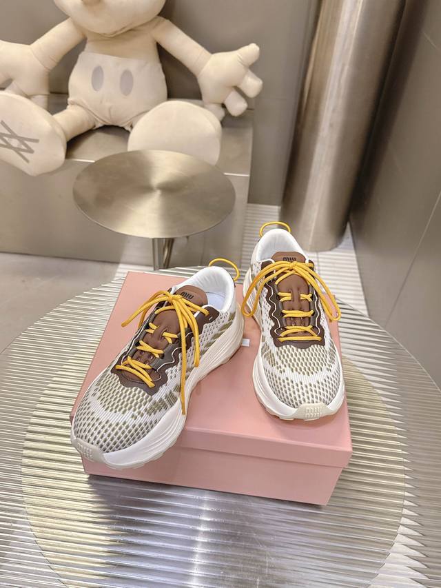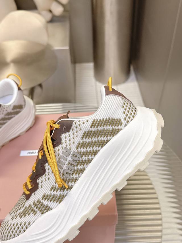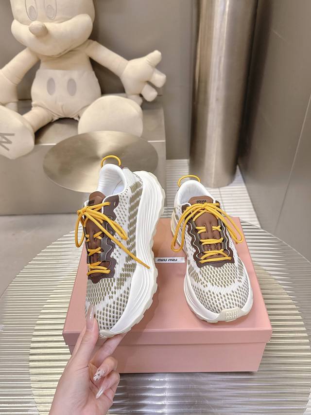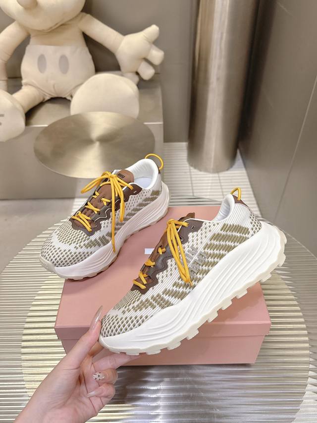 缪缪 在引领纤细的 薄底鞋 美学多年后,Miu Miu 悄然转向,上架了一款名为 Technical Fabric Sneakers 的厚底运动鞋。这款新作并非 Hoka One One 联名款,但从夸张的轮廓到生胶大底细节处理,确实容易让人联想到后者的经典设计。
