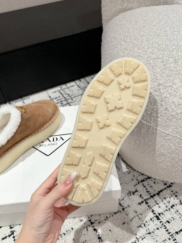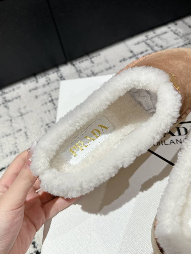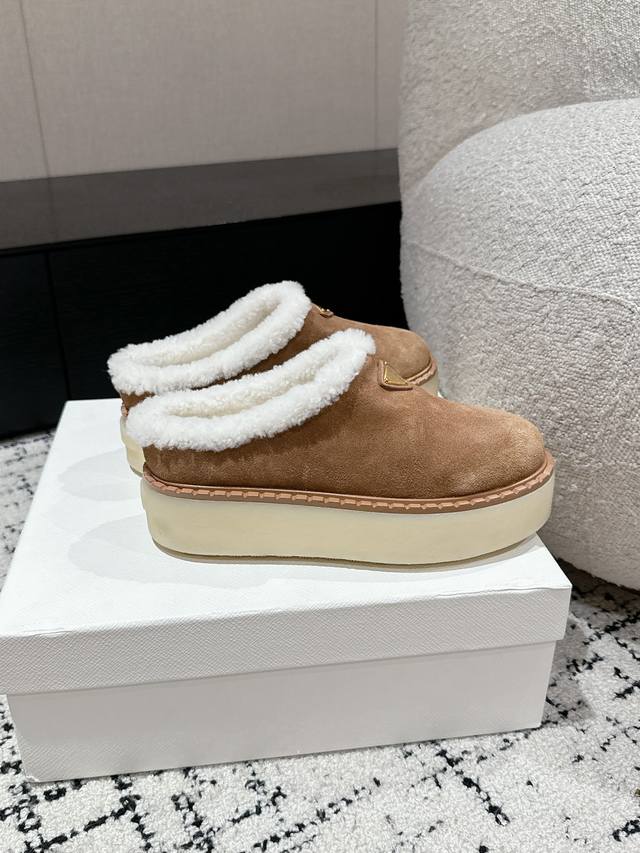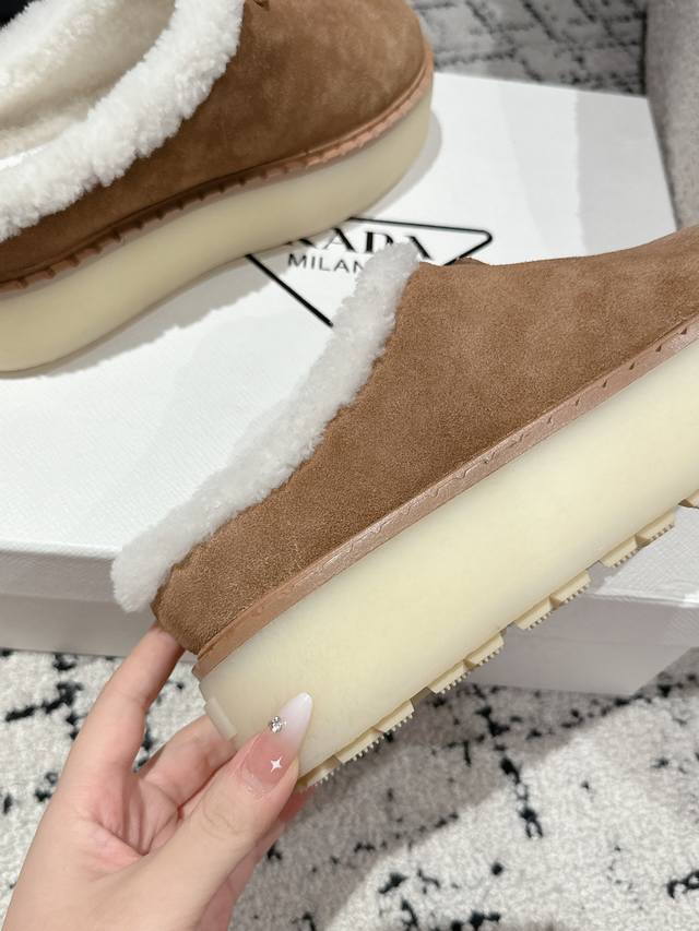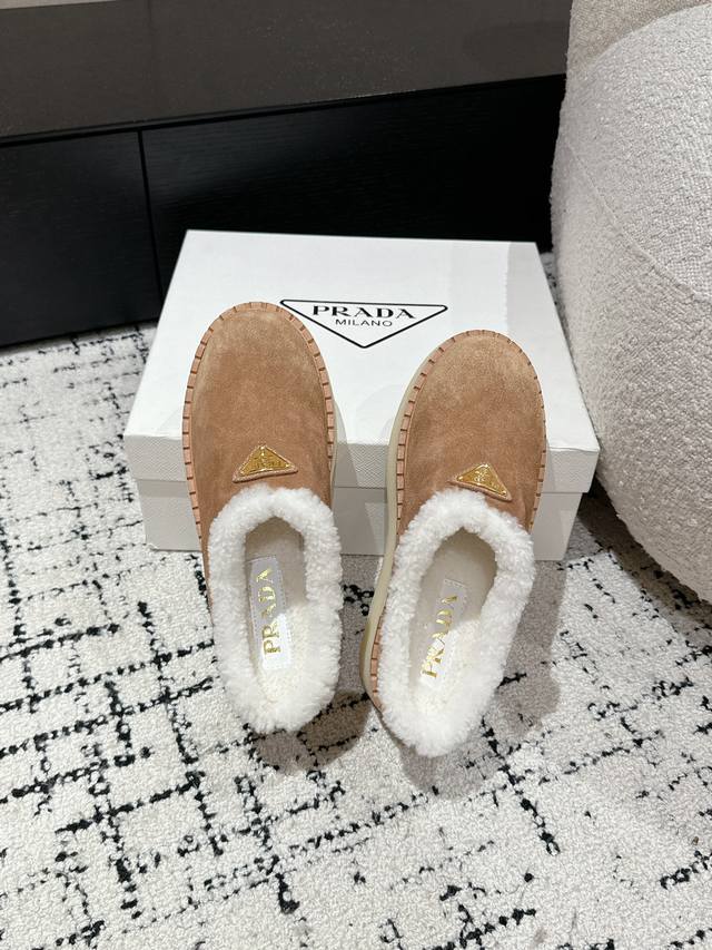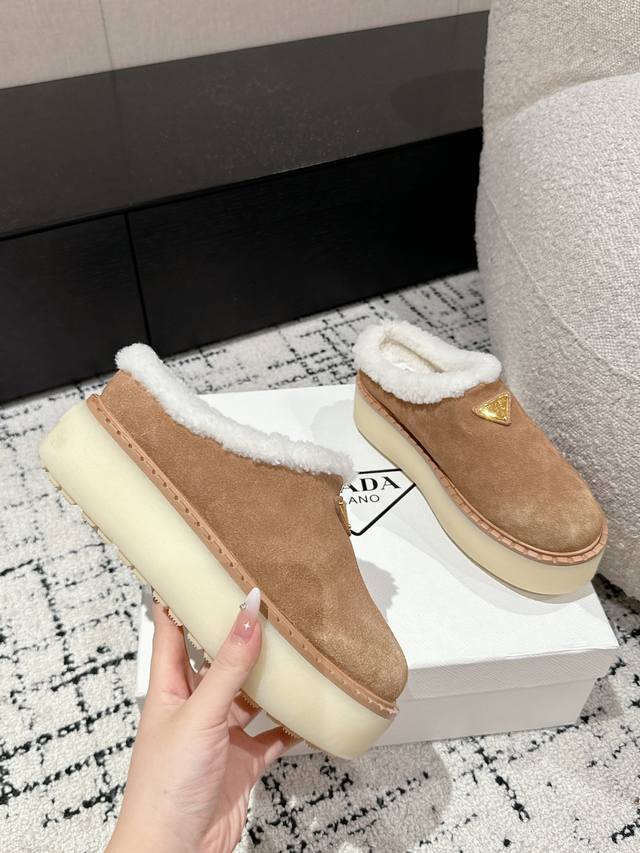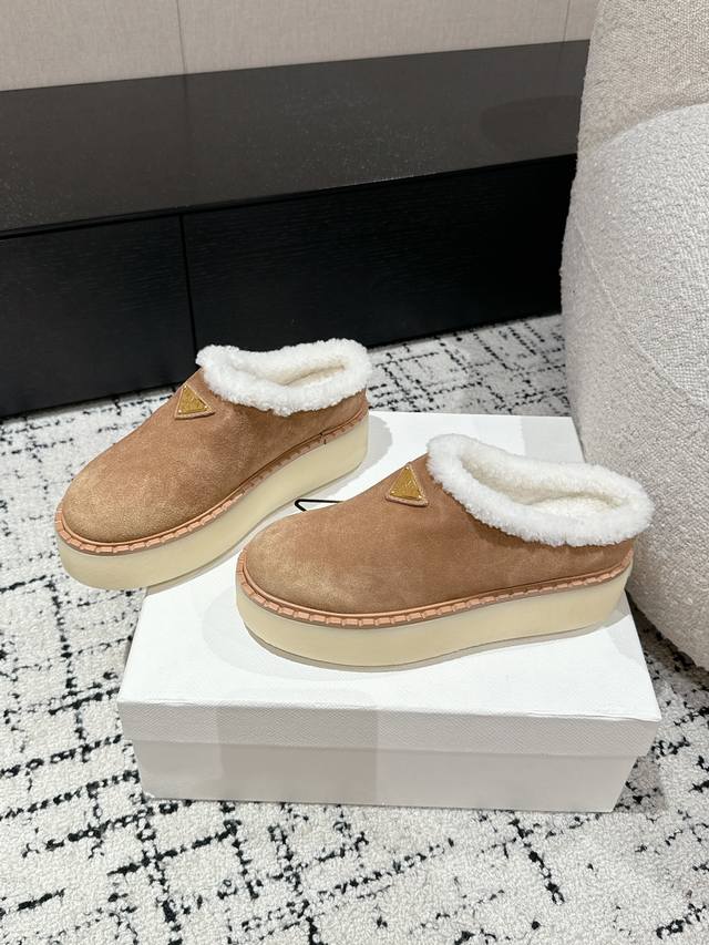 代购级 Prada普拉达 24 厚底 休闲 羊毛半拖 这款运动鞋延续经久不衰的轮廓,是新款经典单品 采用麂皮 精心制作, 提升格调 款式轻盈,搭配三角扣标志加5