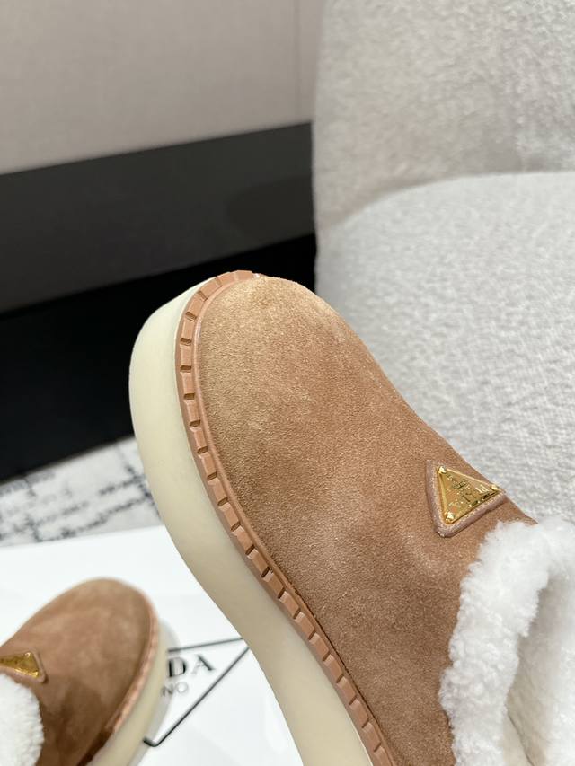 最新Prada普拉达:新奇别致的柔软牛皮面,纯羊毛里,独特的设计的风格,为此款复古风雪地靴注入心裁别出的设计巧思...