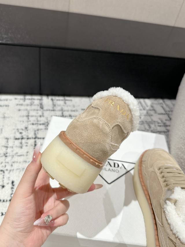 / 代购级 Prada普拉达 24 最新 厚底休闲 羊毛短靴 这款运动鞋延续经久不衰的轮廓,是新款经典单品 采用麂皮 精心制作, 提升格调 款式轻盈,搭配三角扣标志