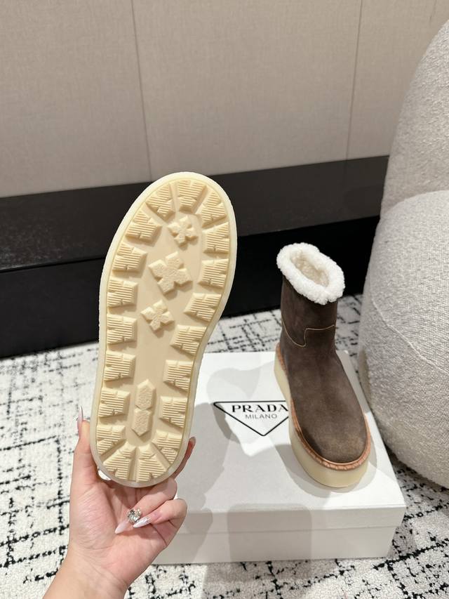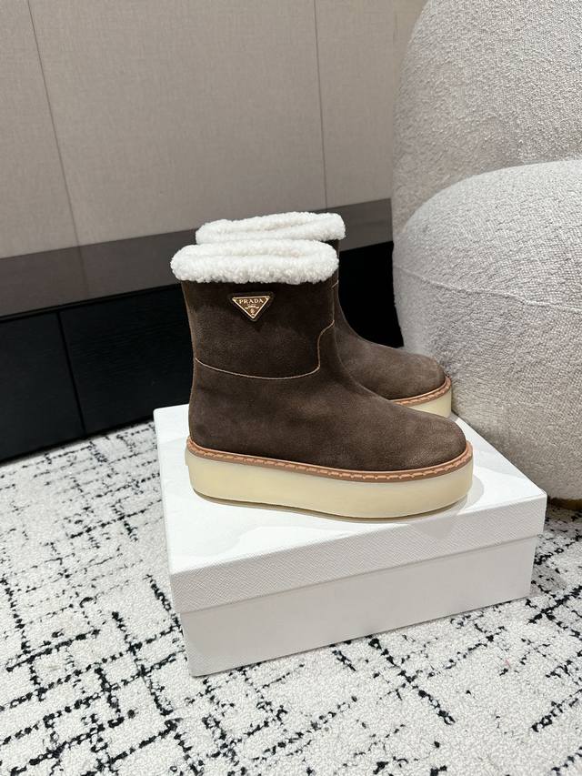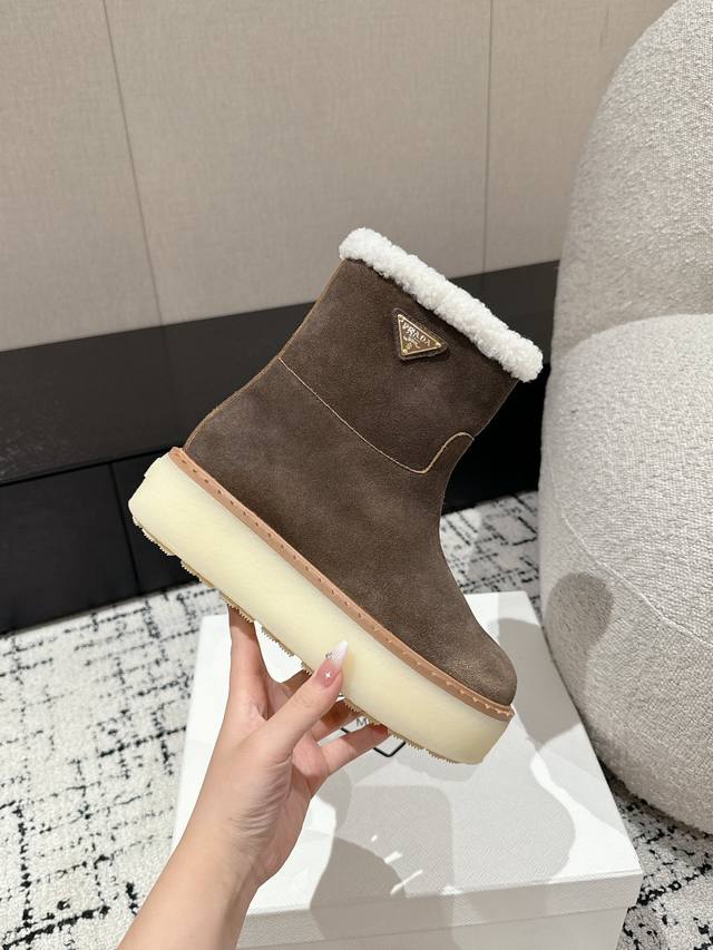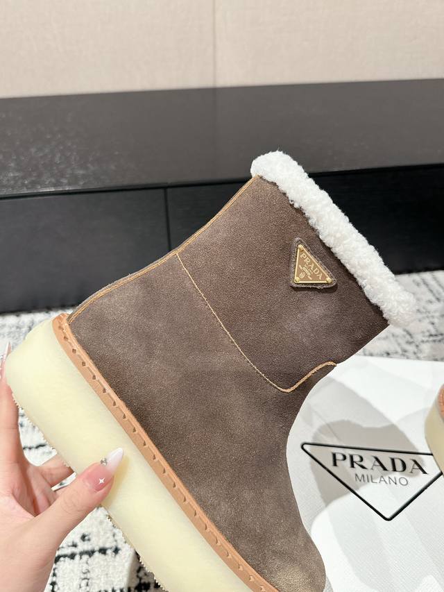 代购级 Prada普拉达 24 最新 厚底 雪地靴 这款雪地靴延续经久不衰的轮廓,是新款经典单品 采用麂皮 精心制作, 提升格调 款式轻盈,搭配三角扣标志加5C
