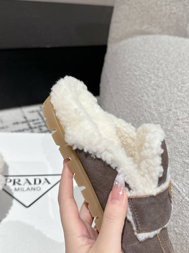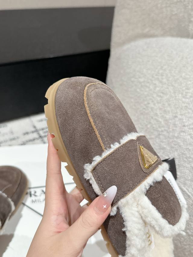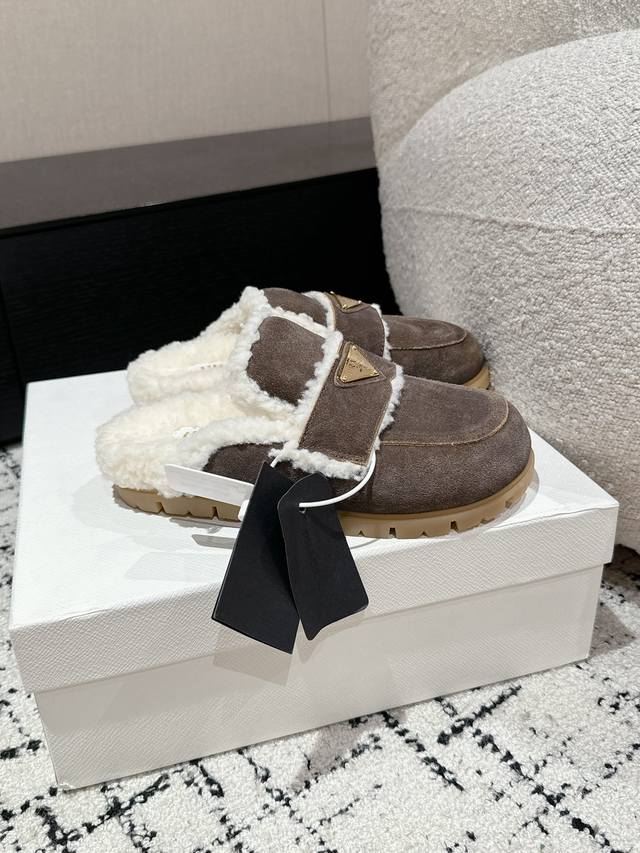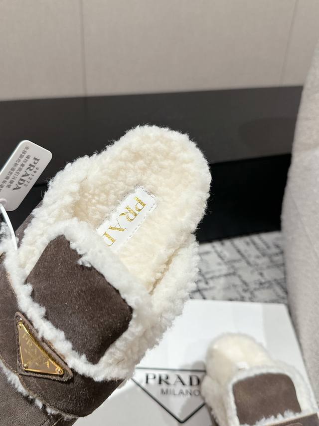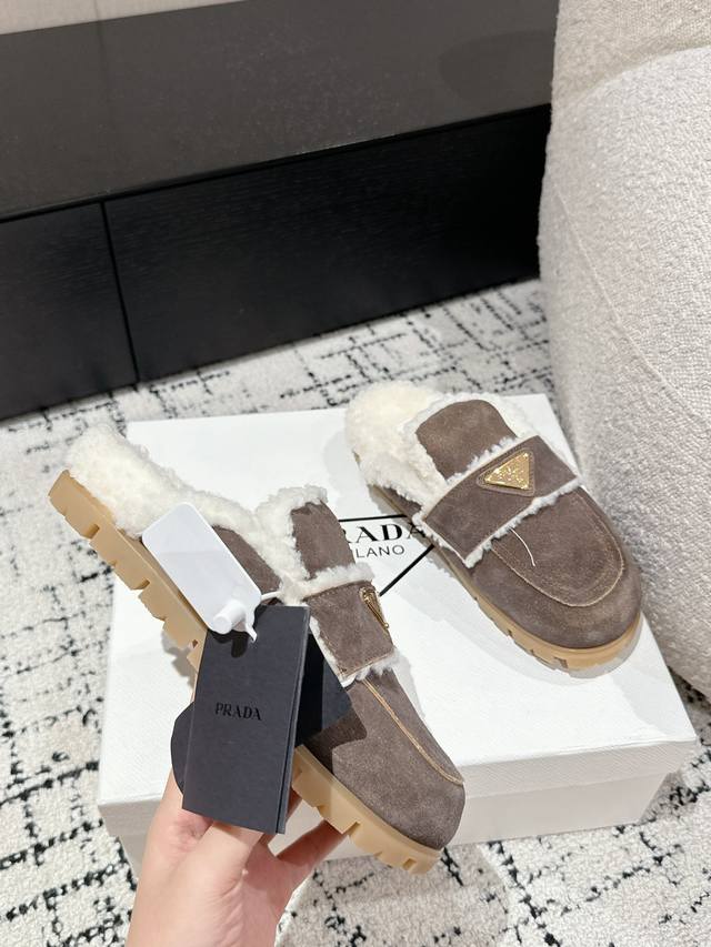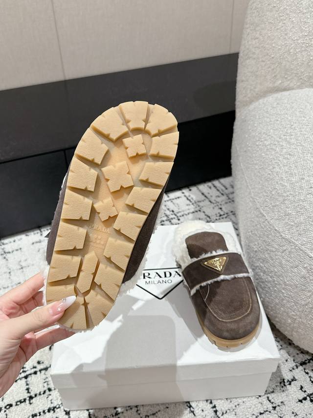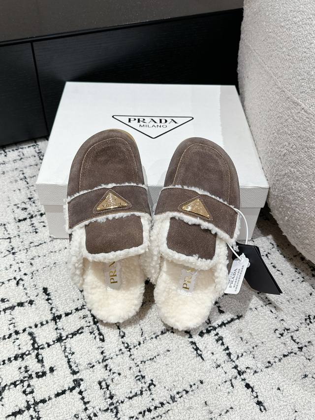 代购级 Prada普拉达 24 经典三角标毛拖 这款运动鞋延续经久不衰的轮廓,是新款经典单品 采用麂皮 精心制作, 提升格调 款式轻盈,搭配三角扣标志四季皆宜,可与各式休闲造型搭配,在各种风格充斥眼球的时代,最能长久陪伴搭配的 一点一点俘获人心 面料: 进口麂皮 内里: 羊羔毛 大底: Tpu防滑大底 +真皮沿条 Size:#35-41 40 41订做不退换