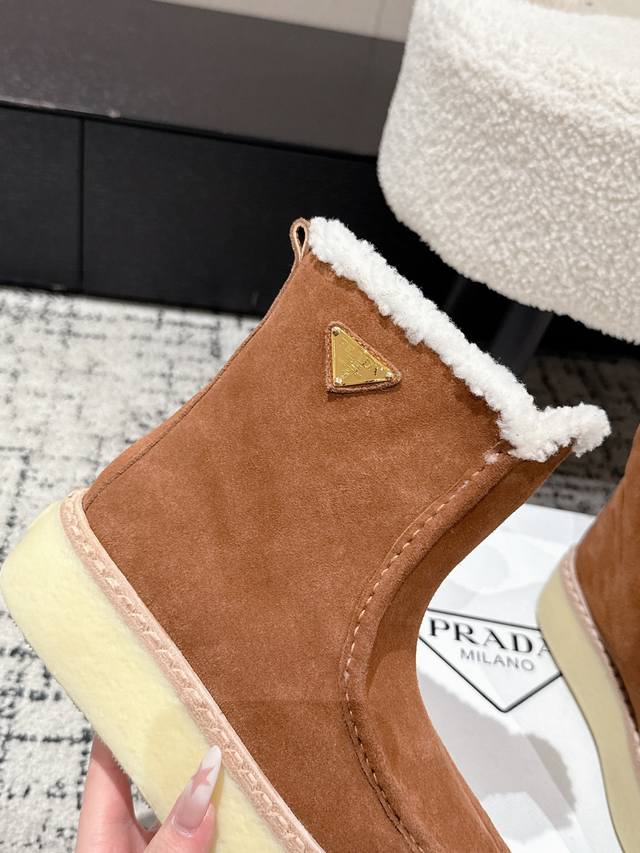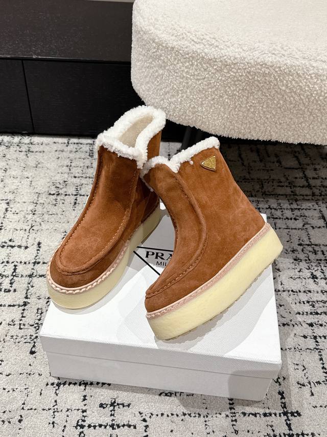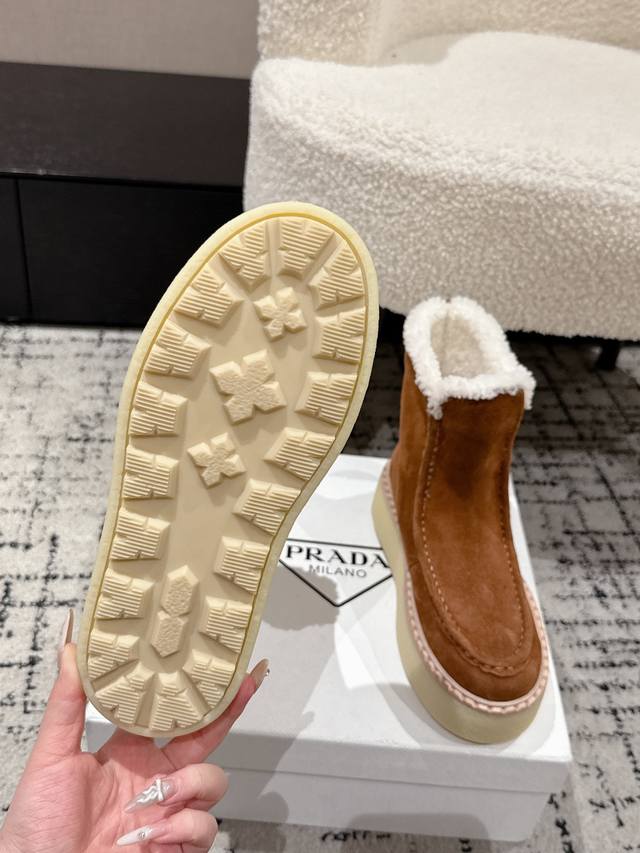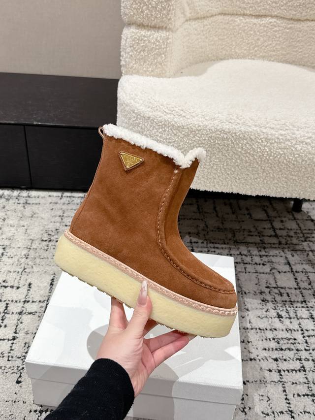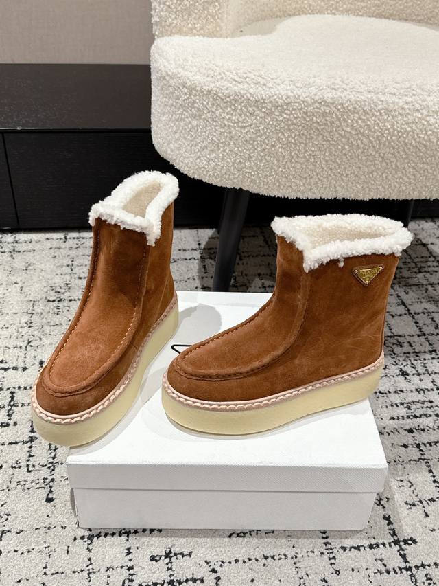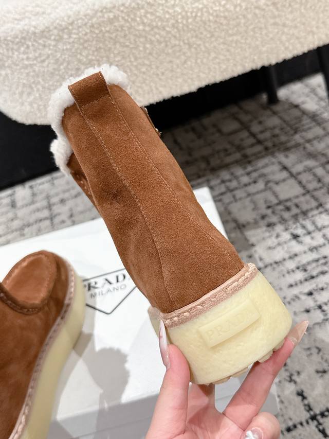 代购级 DDD prada普拉达 25 最新 厚底 雪地靴 DDD 这款雪地靴延续经久不衰的轮廓,是新款经典单品 采用麂皮 精心制作, 提升格调 款式轻盈,搭配三角扣标志加5Cm厚底 四季皆宜,可与各式休闲造型搭配,在各种风格充斥眼球的时代,最能长久陪伴搭配的 一点一点俘获人心 DDD 面料: 进口麂皮 DDD 内里: 澳洲进口羊羔毛 DDD 大底: Tpu防滑大底 +真皮沿条 DDD 底厚: 5Cm DDD Size:#35-41 40 41订做不退换 DDD