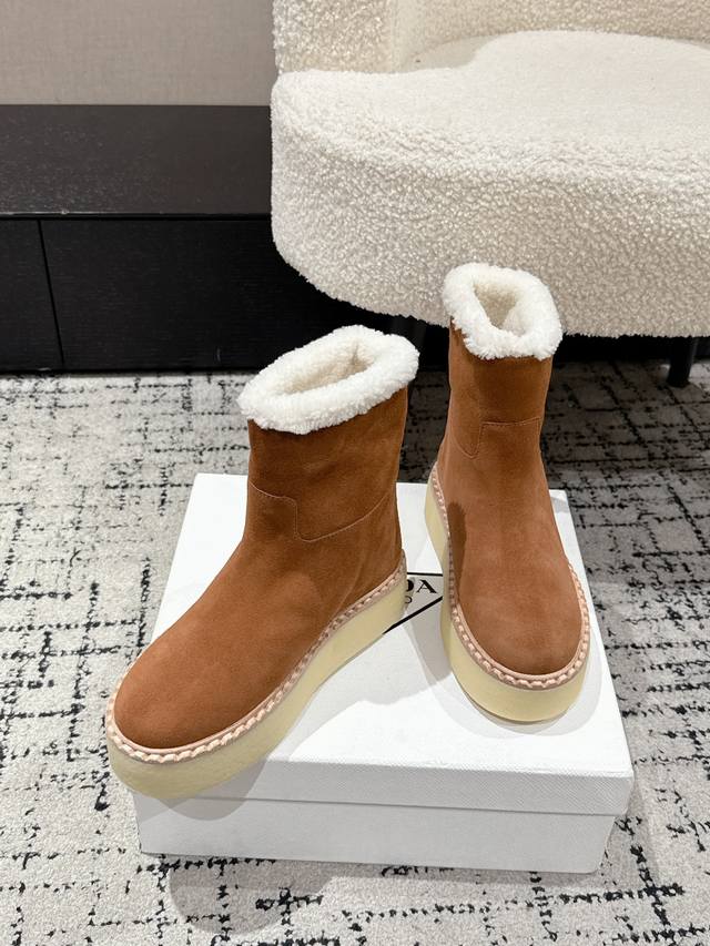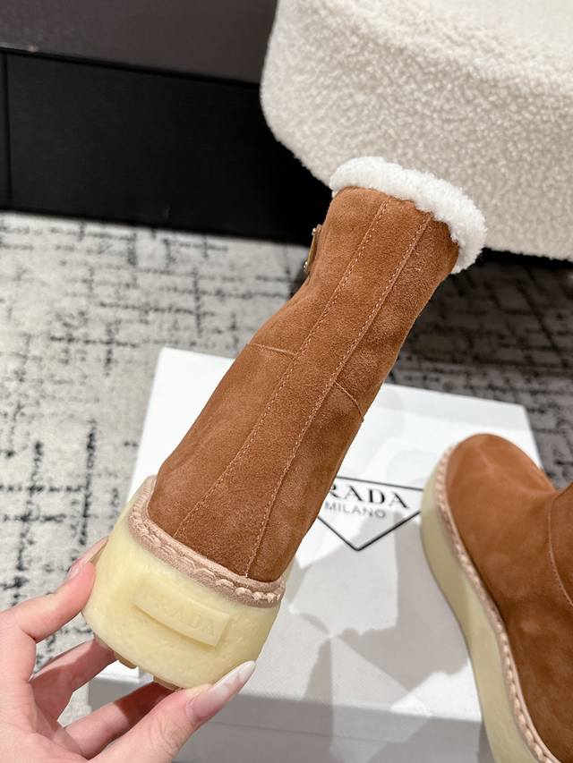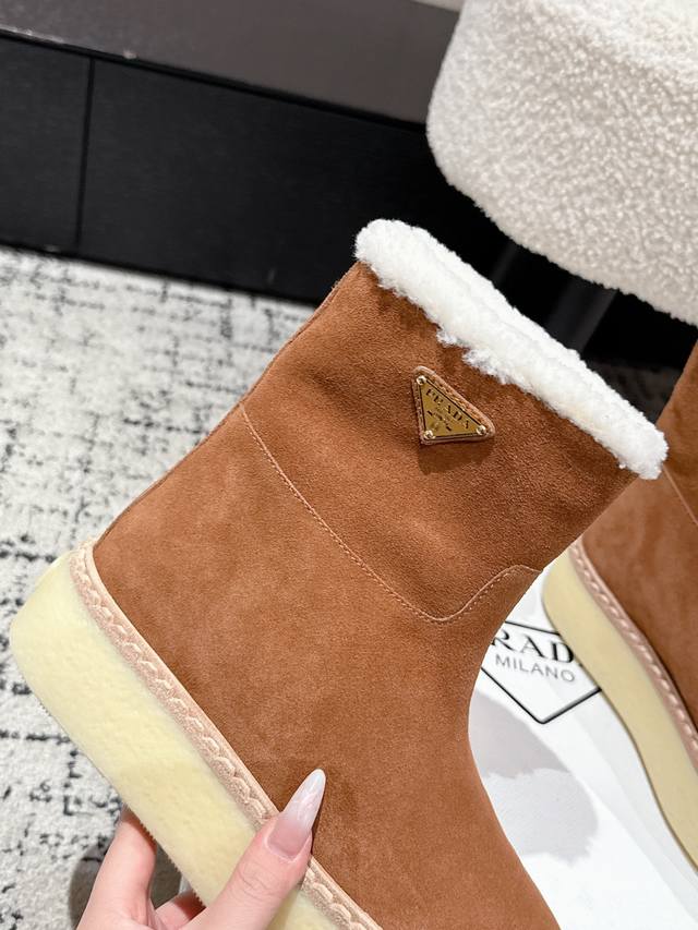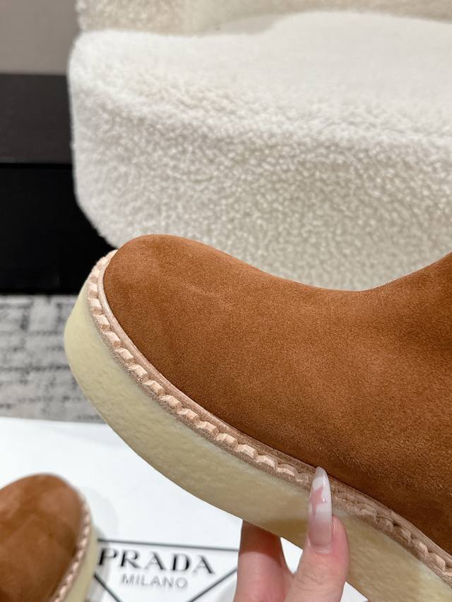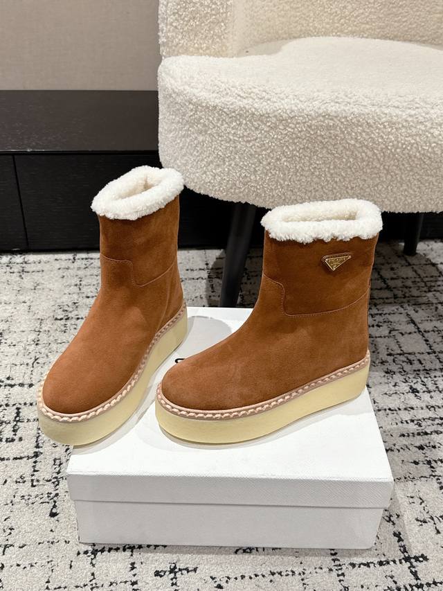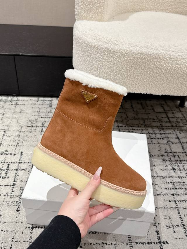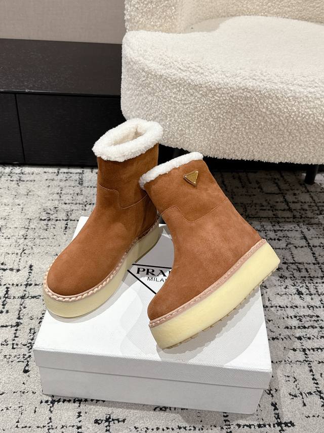 代购级 DDD prada普拉达 25 最新 厚底 雪地靴 DDD 这款雪地靴延续经久不衰的轮廓,是新款经典单品 采用麂皮 精心制作, 提升格调 款式轻盈,搭配三角扣标志加5Cm厚底 四季皆宜,可与各式休闲造型搭配,在各种风格充斥眼球的时代,最能长久陪伴搭配的 一点一点俘获人心 DDD 面料: 进口麂皮 DDD 内里: 澳洲进口羊羔毛 DDD 大底: Tpu防滑大底 +真皮沿条 DDD 底厚: 5Cm DDD Size:#35-41 40 41订做不退换 DDD