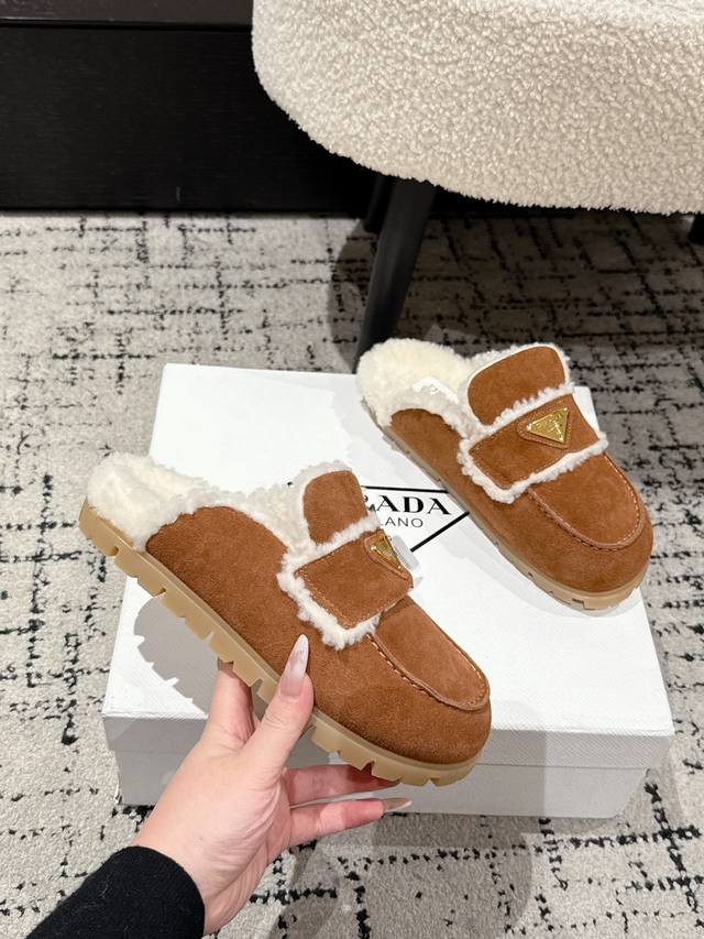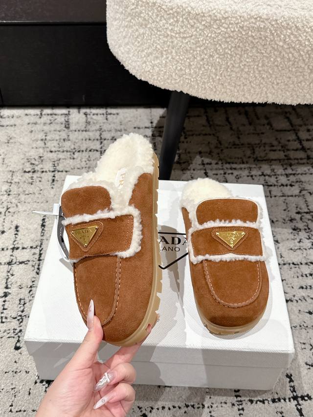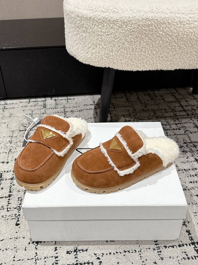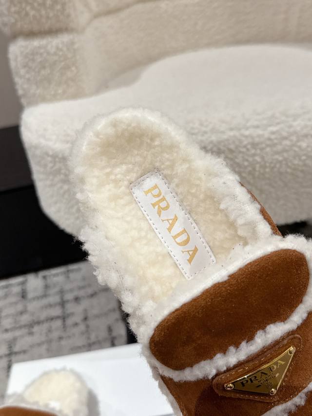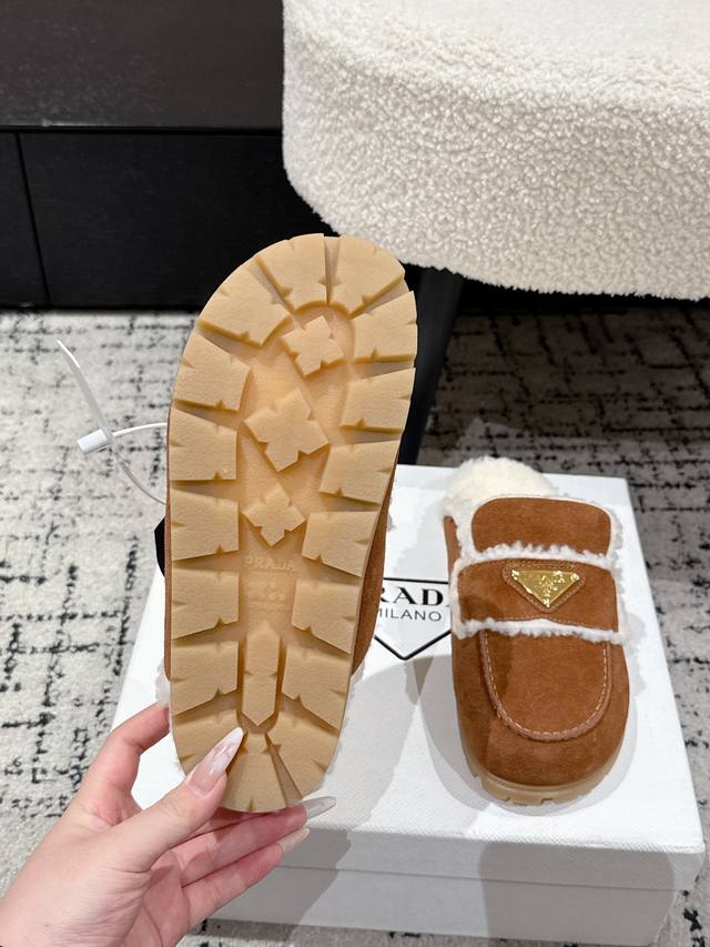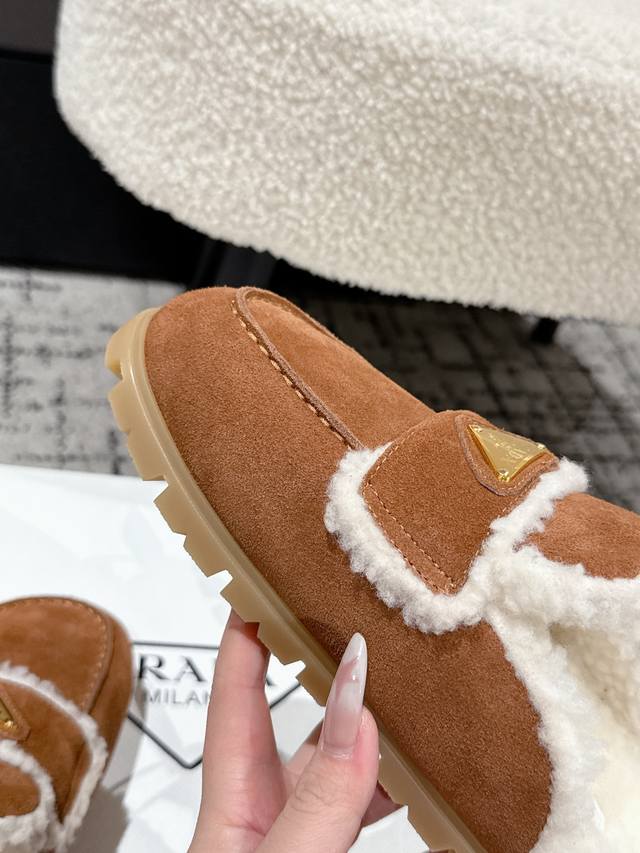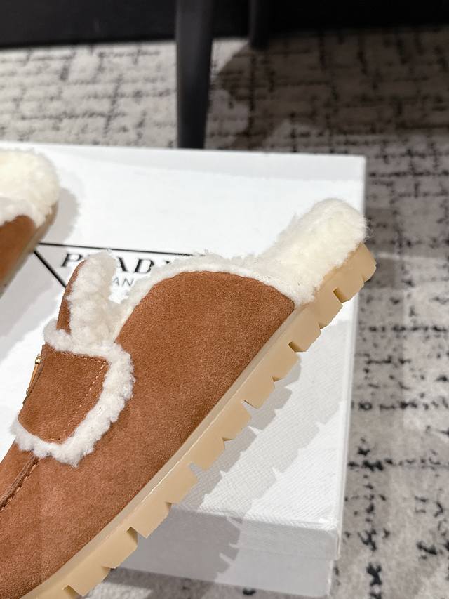 代购级 prada普拉达 25 经典三角标 包头 毛拖 这款运动鞋延续经久不衰的轮廓,是新款经典单品 采用麂皮 精心制作, 提升格调 款式轻盈,搭配三角扣标志四