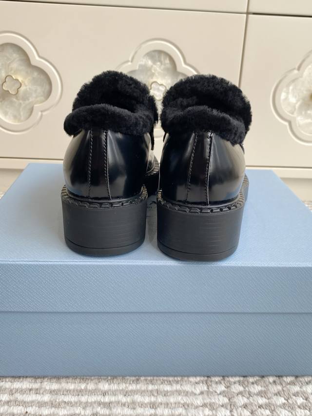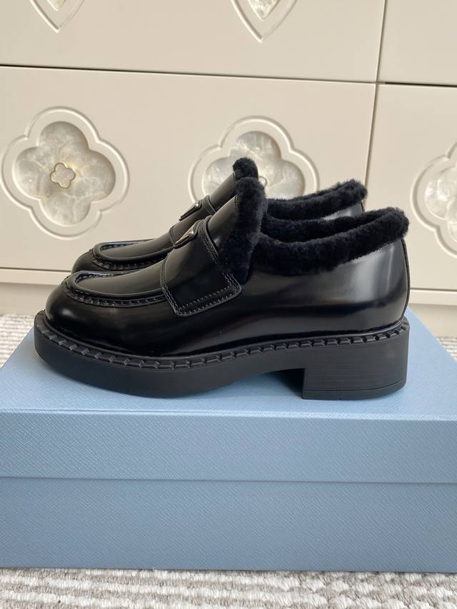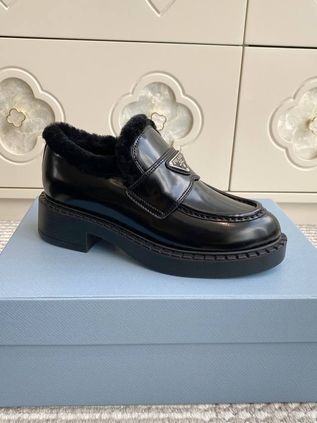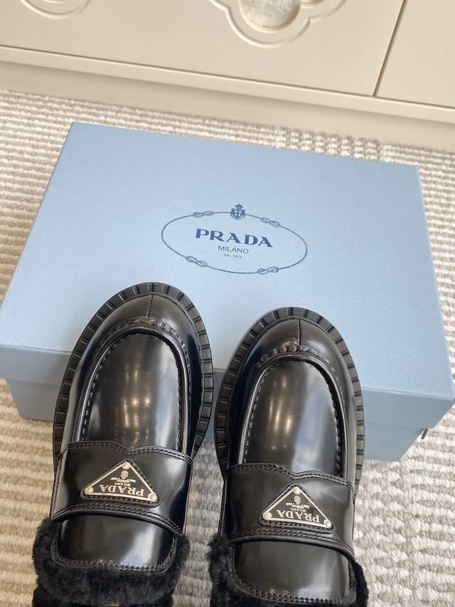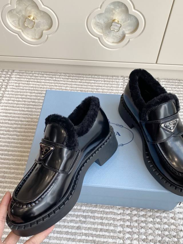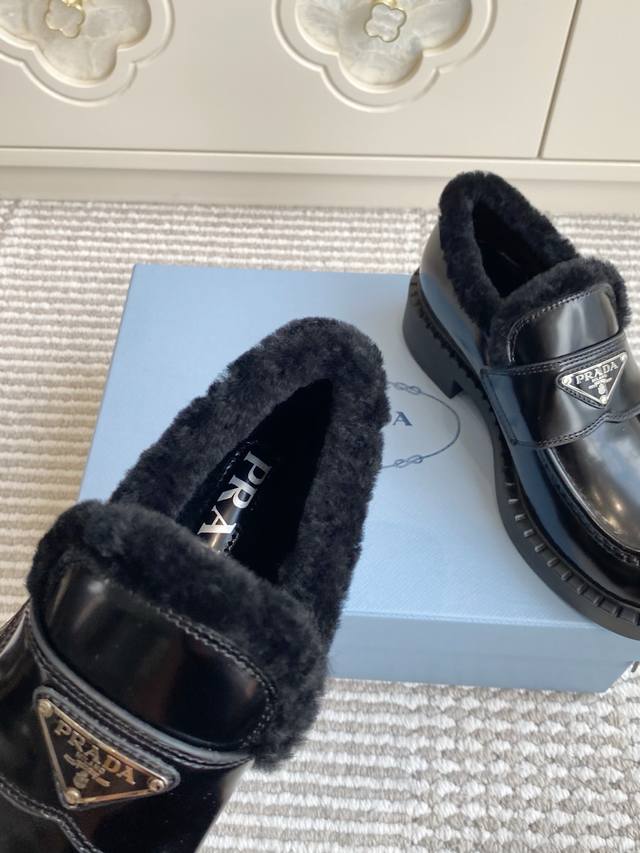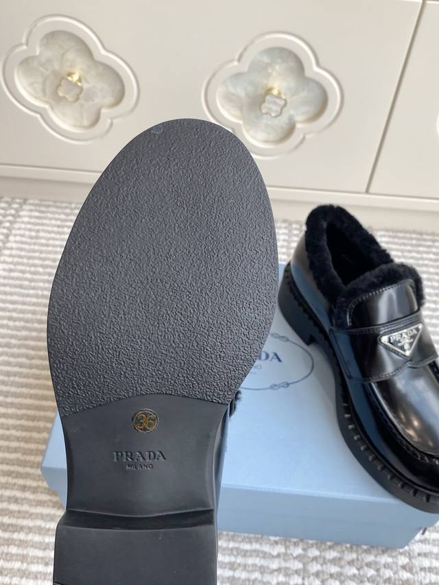 代购级 Prada普拉达2025秋冬新款三角标保暖 羊毛厚底乐福鞋|顶级代购级别品质 材质与工艺: 原版开边珠牛皮 牛漆皮 麂皮 160%羊毛 Zp开模大底 Size:35-39 40、41定做不退换