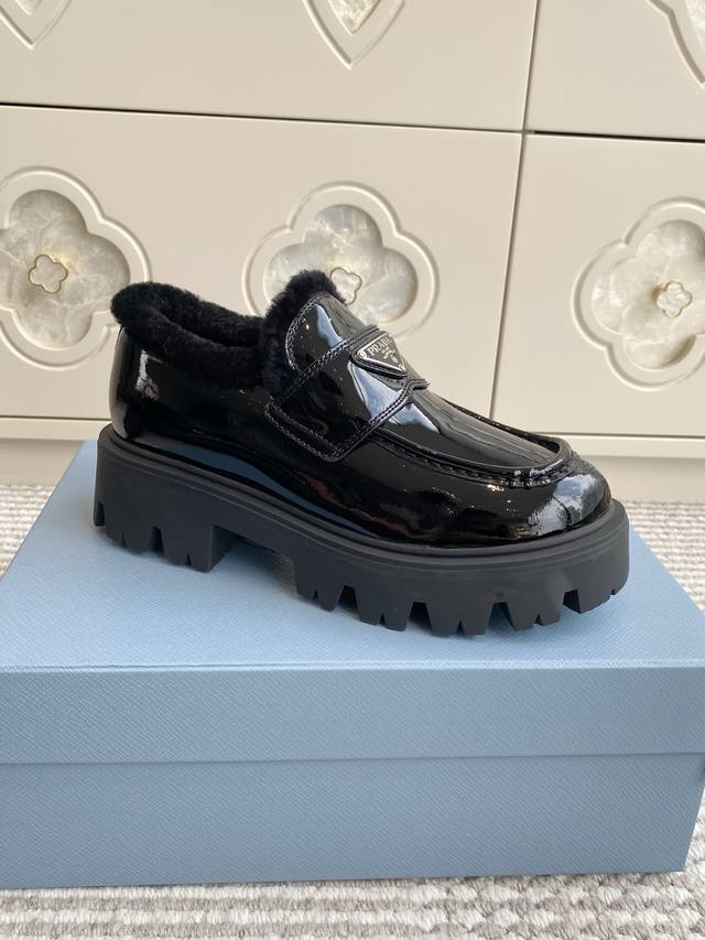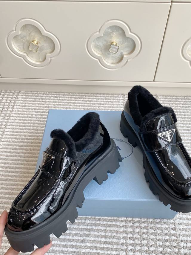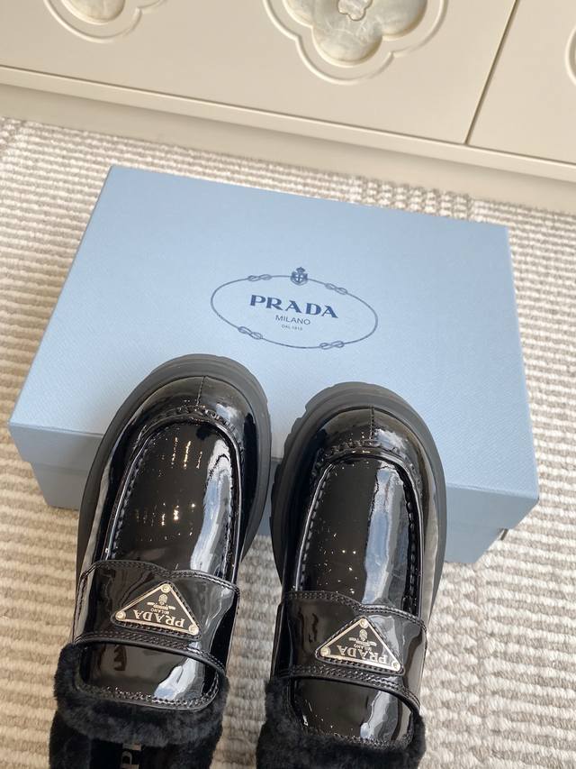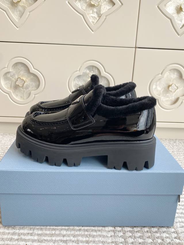 代购级 Prada普拉达2025秋冬新款三角标保暖 羊毛厚底乐福鞋|顶级代购级别品质 材质与工艺: 原版开边珠牛皮 牛漆皮 麂皮 170%羊毛 Zp开模大底 Size:35-39 40、41定做不退换