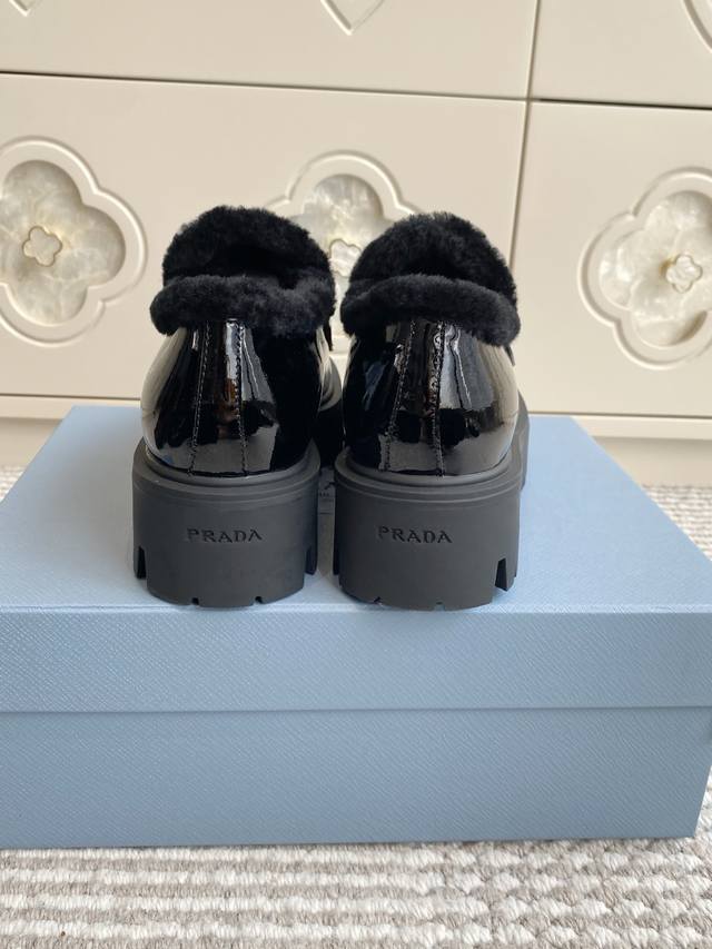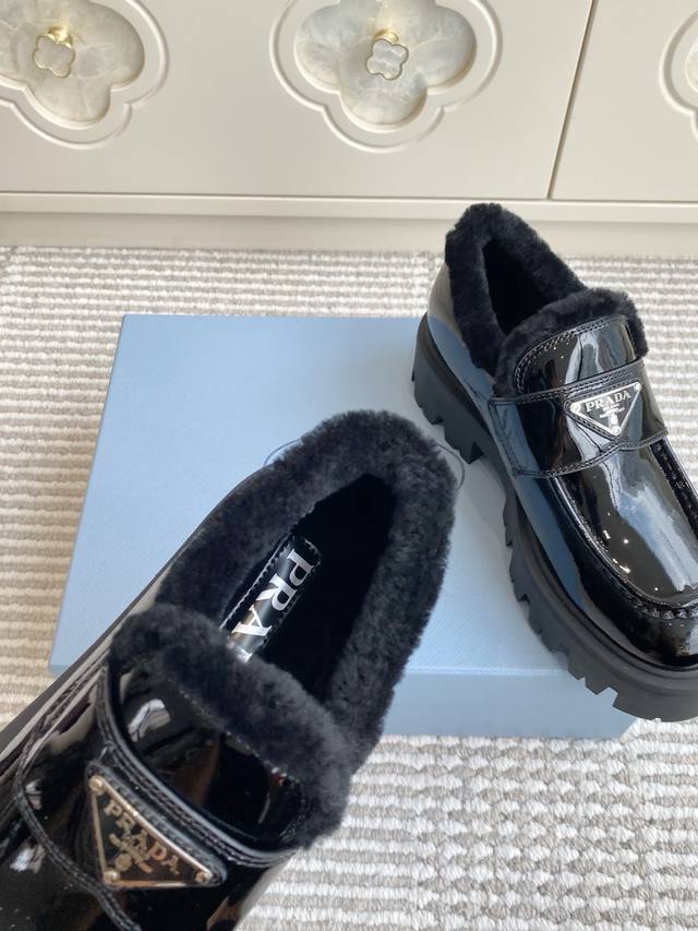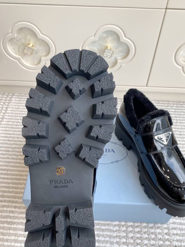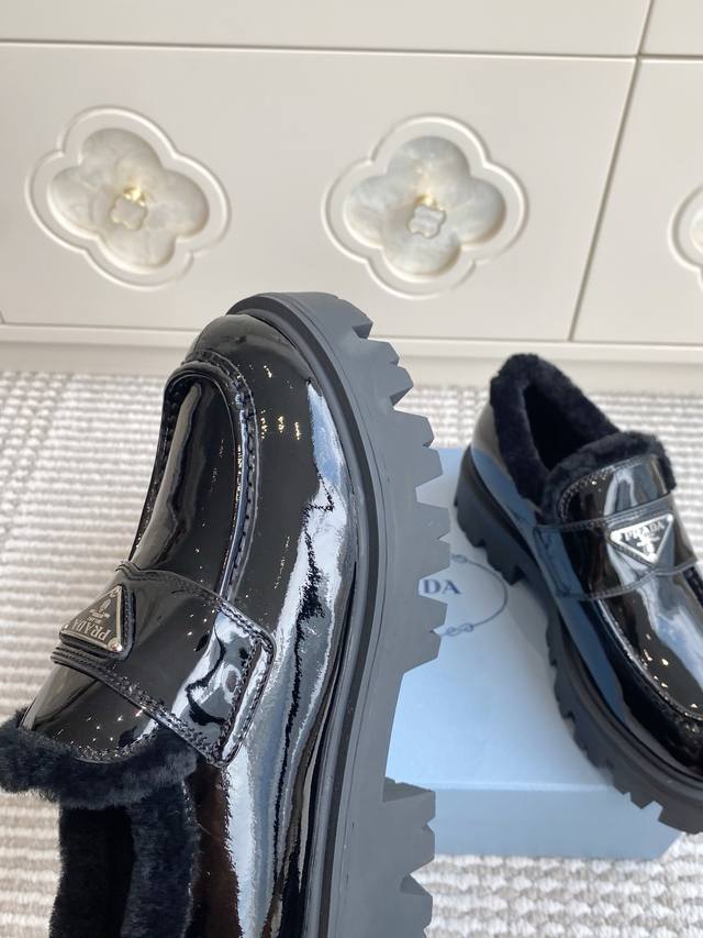 / 代购级 Prada普拉达2025秋冬新款三角标保暖 羊毛厚底乐福鞋|顶级代购级别品质 材质与工艺: 原版开边珠牛皮 牛漆皮 麂皮 170%羊毛 Zp开模大底 S