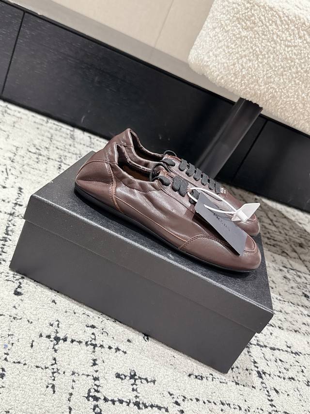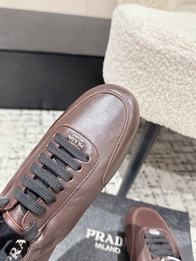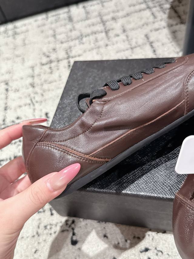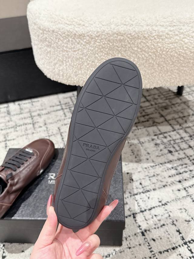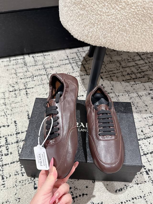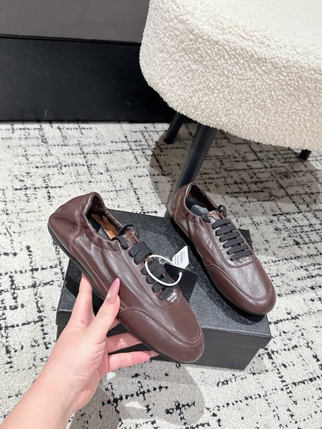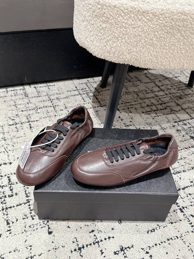 代购级 DDD prada 普拉达 25 最新 走秀 休闲 阿甘 德训鞋 DDD 出镜率很高的就是这款德训鞋 外形是像芭蕾舞鞋一样的跑鞋,柔软的皮质加上prada 专属尼龙材质上脚的轻盈度和舒适度是最抗打的!本来就是复古感拉满的单品,既可以搭配新颖时髦的单品,也可以搭配整体做旧的复古感造型,都可以完美驾驭 DDD 鞋面: 进口软羊皮面 DDD 内里: 无内里羊皮垫脚 DDD 大底: 原版薄底 DDD Size: #35-41 40.41定做不退换 DDD