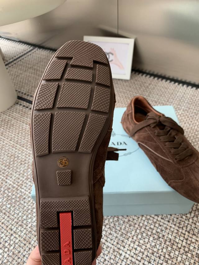 / 代购级 Prada 普拉达 25Ss春夏新款 德训鞋 休闲鞋 精工制造,缝线均匀,皮质质感一览无余,多色拼接,时尚大方,柔软舒适透气,外侧饰有Prada字母徽标