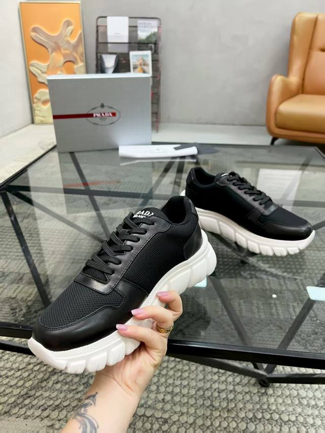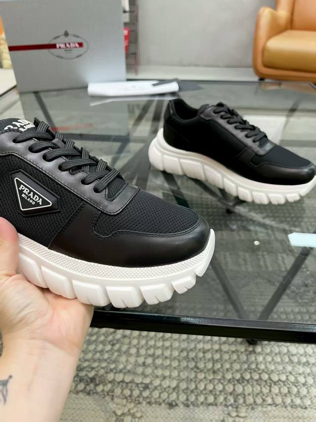 / 元 38-45 A 普拉达新款男士真皮运动鞋,市面最高版本 、欢迎任意对比!原版皮料质感极佳,超上档次!意大利进口胎羊网内里,可拆式垫!奢华用料、精细做工,极力