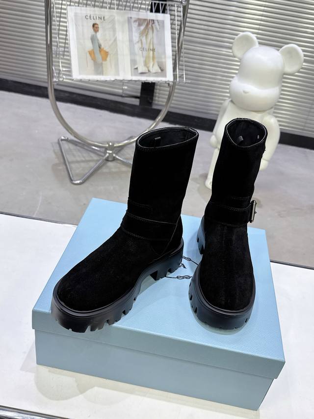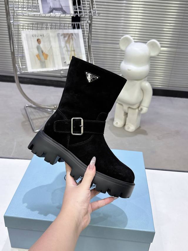出厂价pp 短靴皮面款 prada 普拉达经典三角标一脚蹬王炸女靴 短靴 冬天买不到的系列,绝对是今年的大爆款!!贼好看!prada靴子真的很哇塞!上脚大气显腿