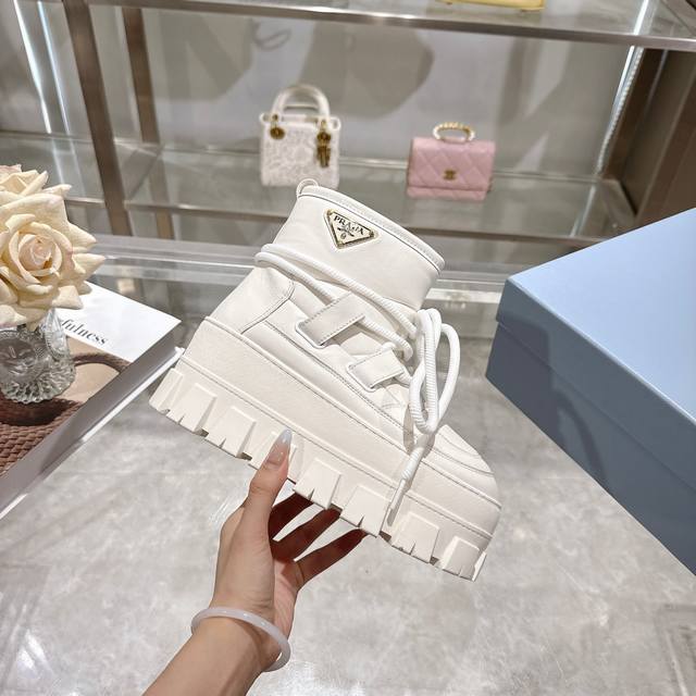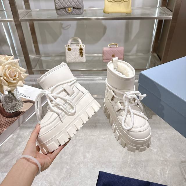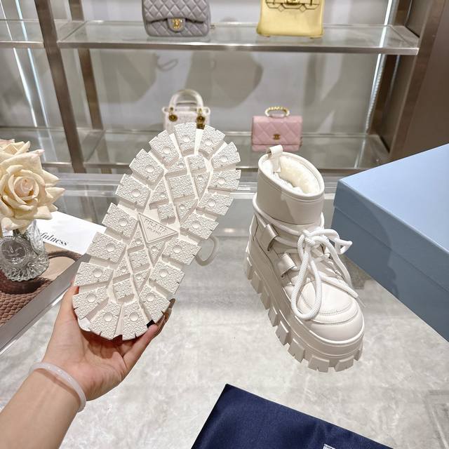 / 出厂价pp 2025最新prada普拉达:新奇别致的柔软牛皮面,纯羊毛里,独特的设计的风格,为此款复古风雪地靴注入心裁别出的设计巧思 4.5厘米橡胶鞋底 涂珐琅
