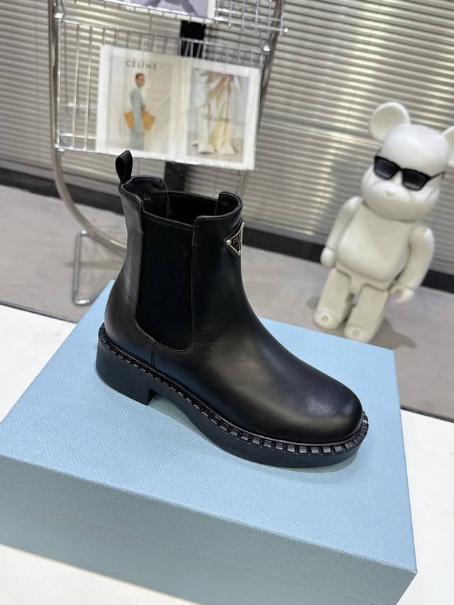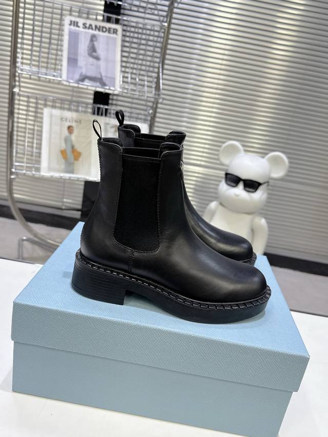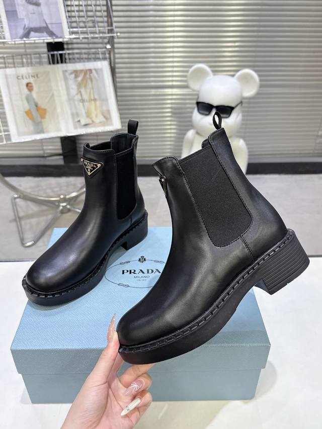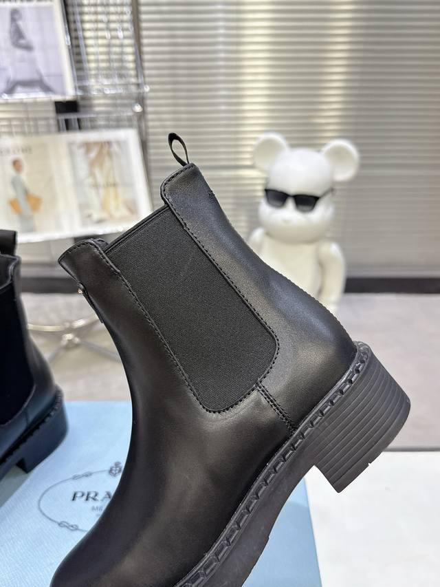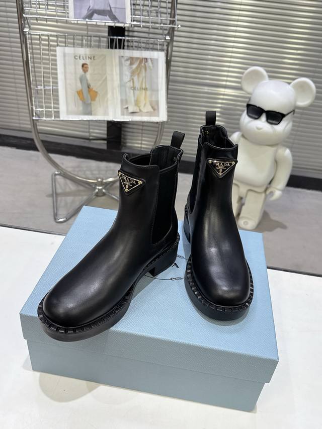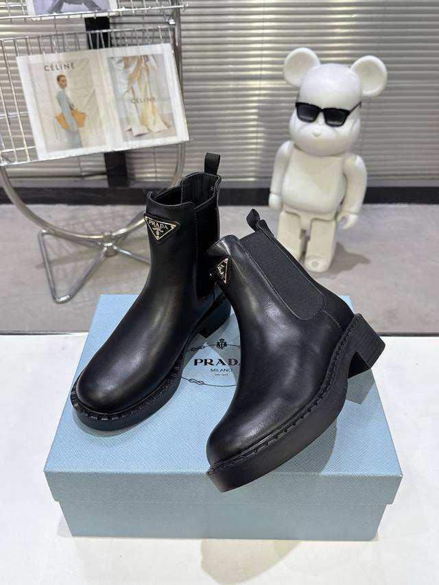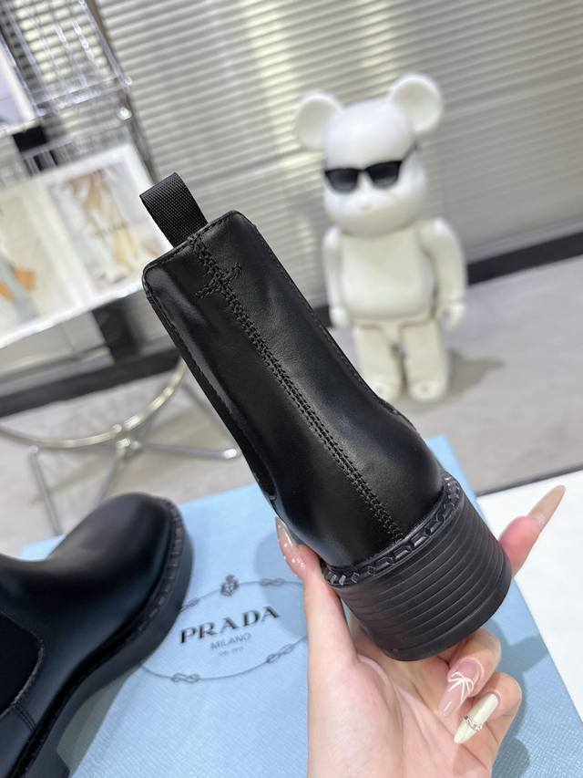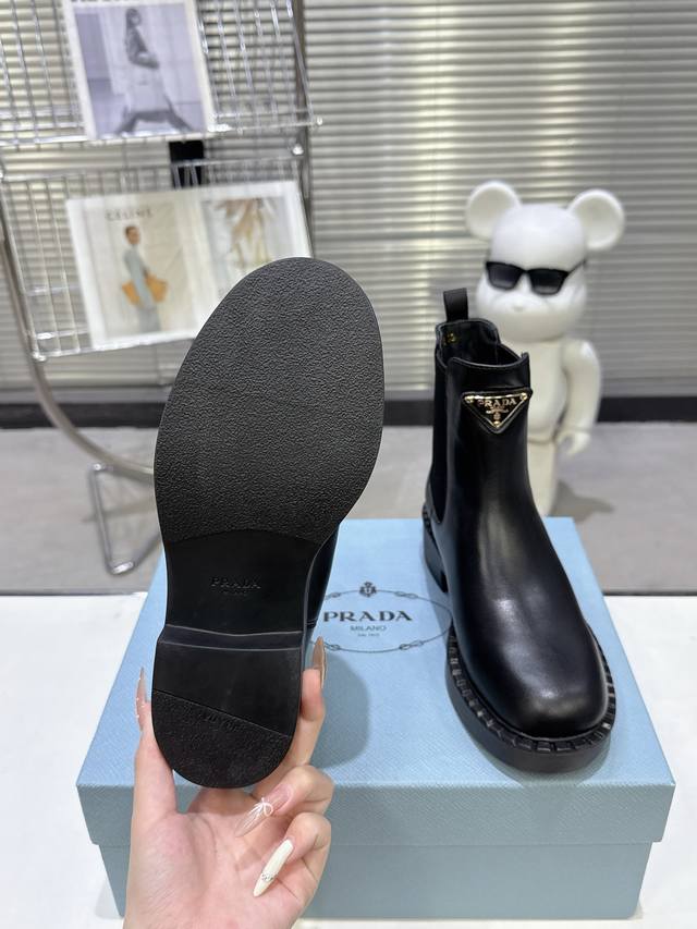 代购版 Prada 普拉达Fwnew Arrival~ P家经典款 秋冬必备切尔西烟管裸靴,厚底短靴子 辨识度极高的轮胎底,经典三角标加持...