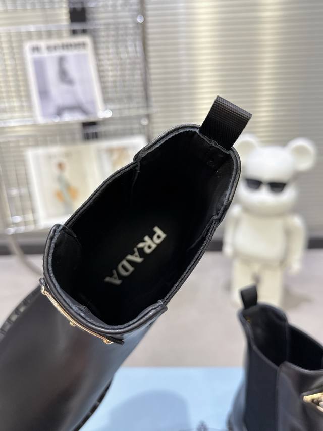 出厂价pp prada普拉达厚底复古马丁靴 橡筋松紧 经典厚底 搭配三角扣 简约大气时尚百搭 面料牛皮,开边珠牛皮 内里垫脚透染羊皮柔软细腻,脚感舒适,橡胶模具
