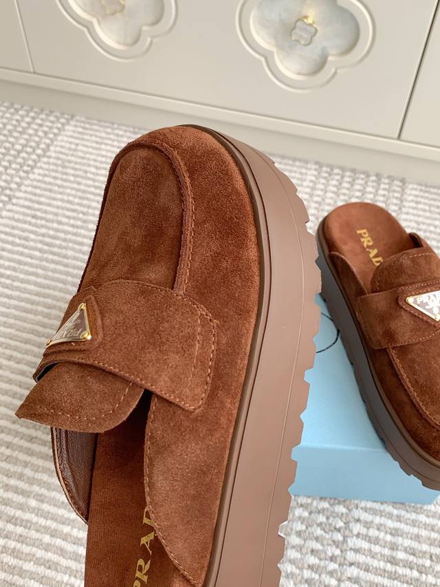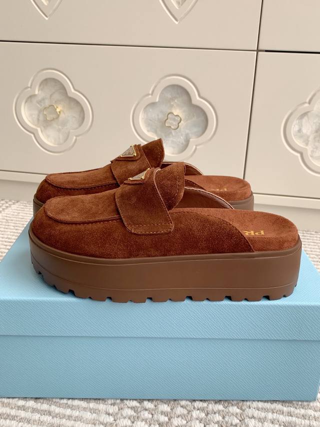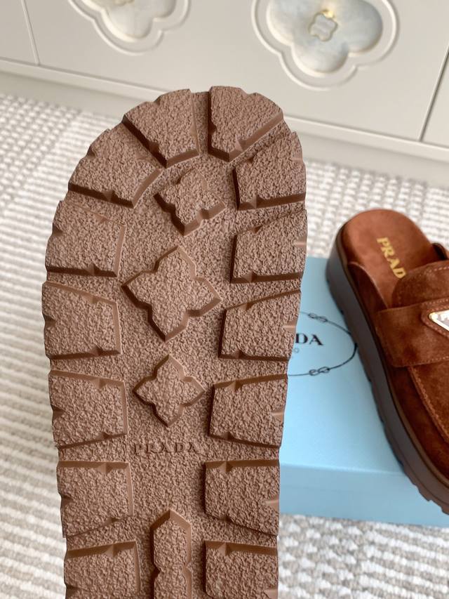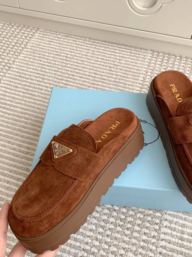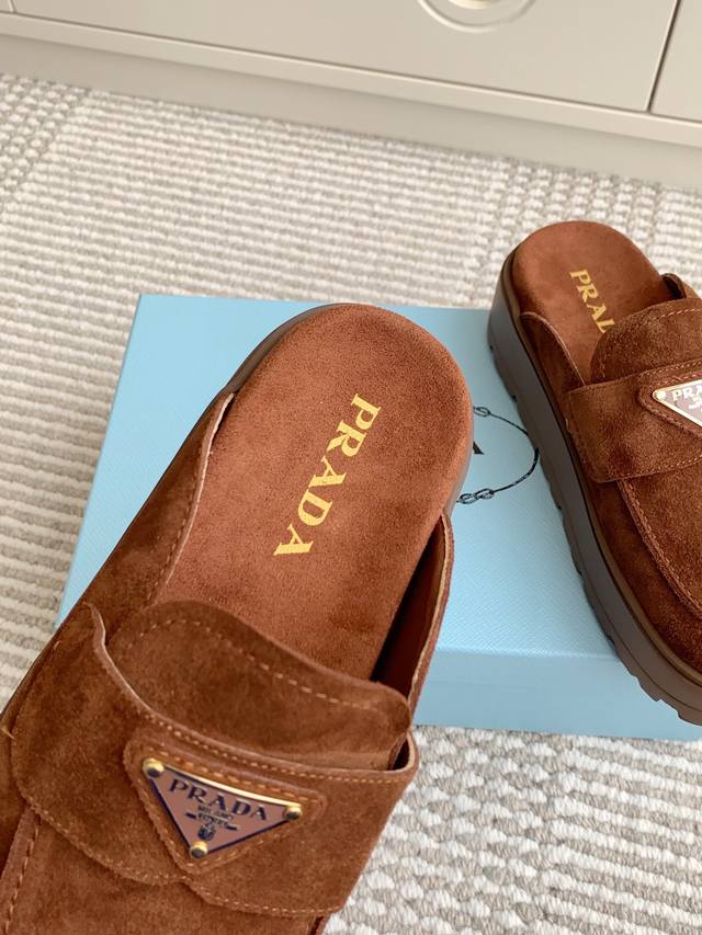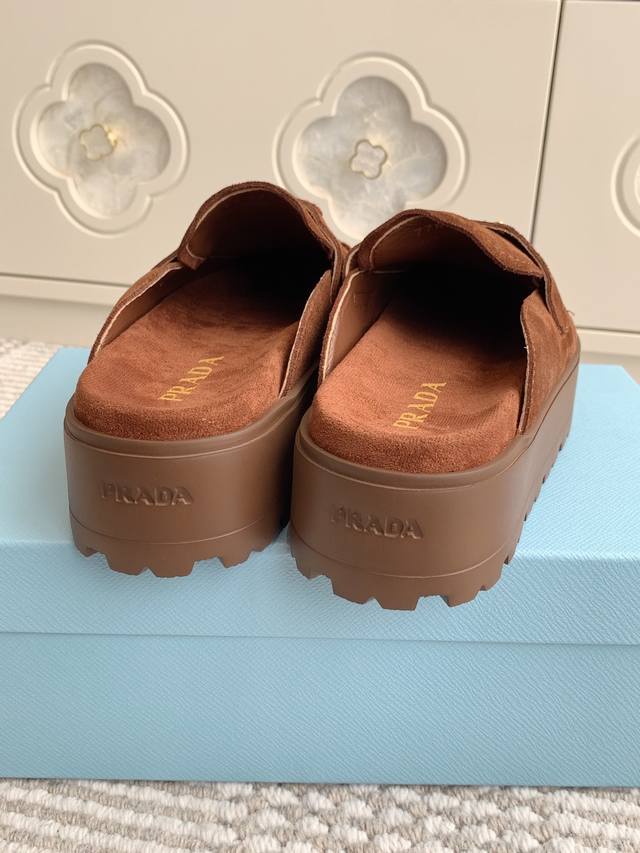 出厂价pp: prada普拉达早春新款三角标厚底勃肯包头穆勒拖鞋 顶级品质 好看到爆炸 舒适百搭,暴走不累 4Cm增高休闲两不误 进口丝光牛反绒 牛皮 羊皮内里