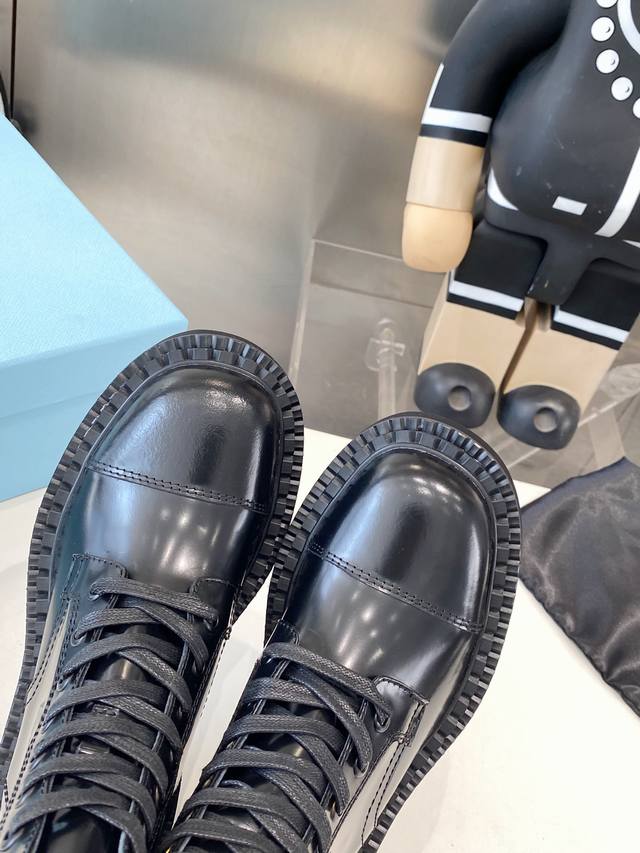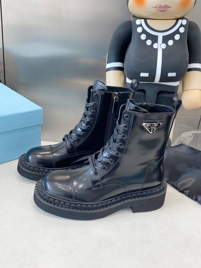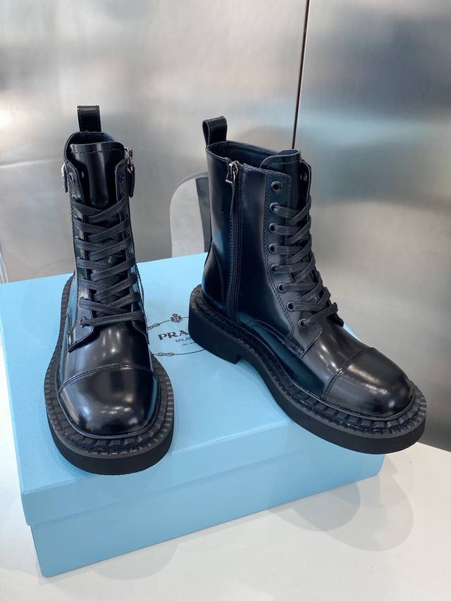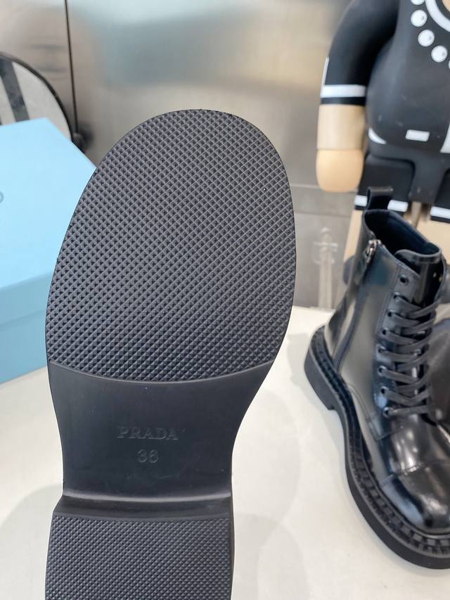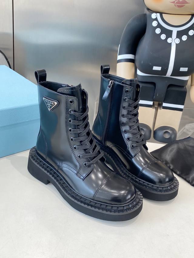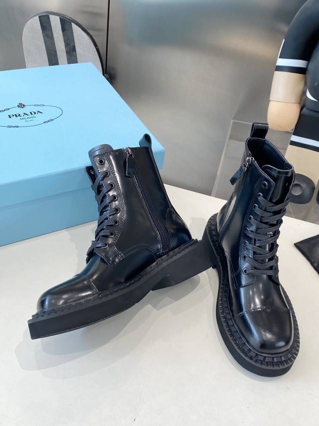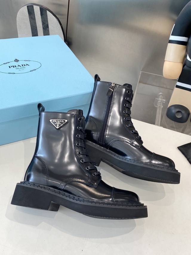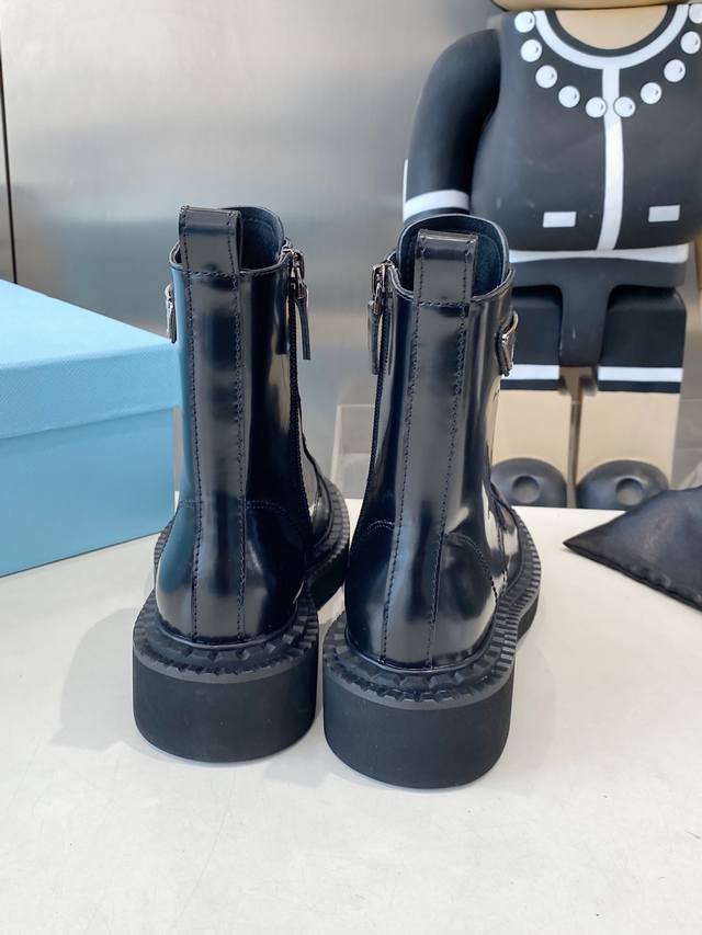 出厂 Prada普拉达经典三角标王炸马丁靴。今年的大爆款。上脚大气显腿瘦,全系列采用多种进口材料:小牛皮,开边珠,牛反绒高丝光,内里水染羊皮!!发泡底轻便舒适。