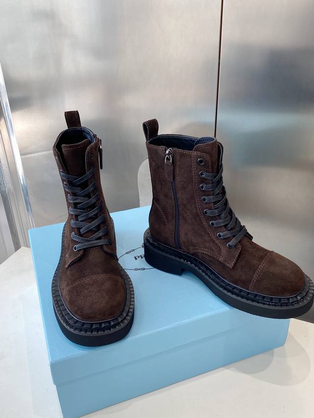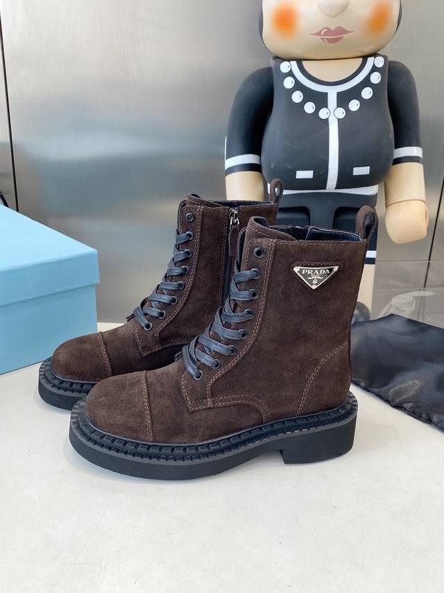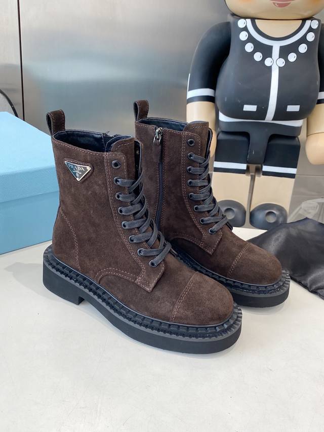 / 出厂 Prada普拉达经典三角标王炸马丁靴。今年的大爆款。上脚大气显腿瘦,全系列采用多种进口材料:小牛皮,开边珠,牛反绒高丝光,内里水染羊皮!!发泡底轻便舒适。