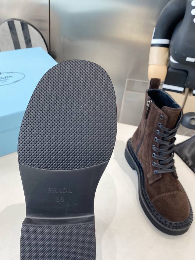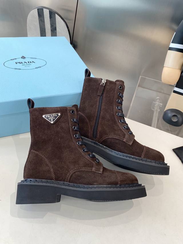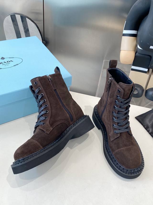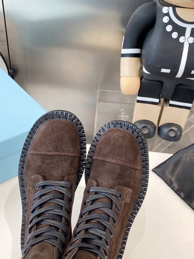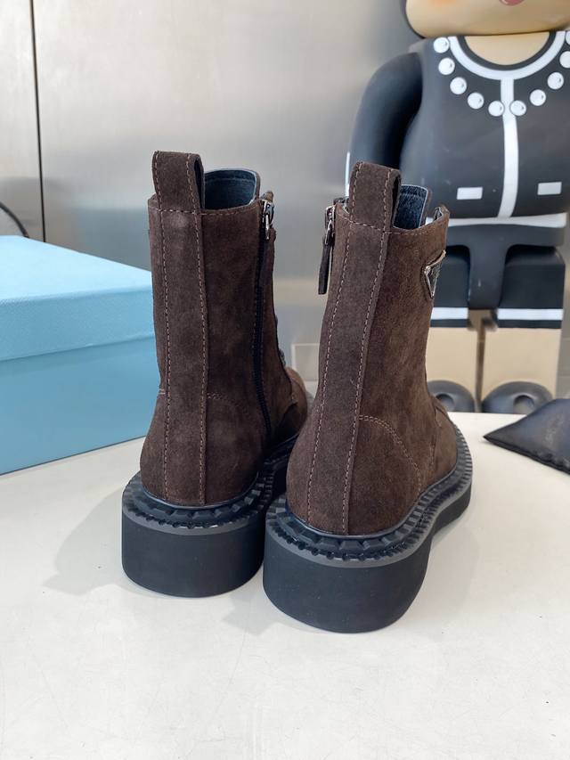 出厂 Prada普拉达经典三角标王炸马丁靴。今年的大爆款。上脚大气显腿瘦,全系列采用多种进口材料:小牛皮,开边珠,牛反绒高丝光,内里水染羊皮!!发泡底轻便舒适。 码数:35-41 41定做不退换