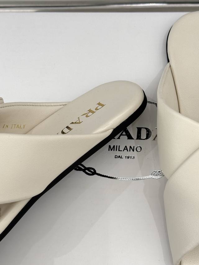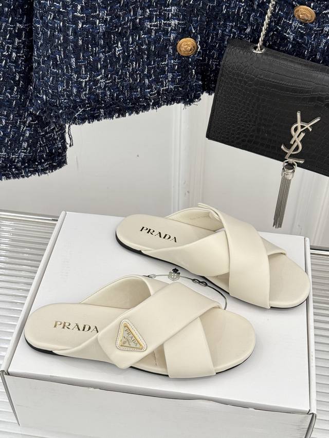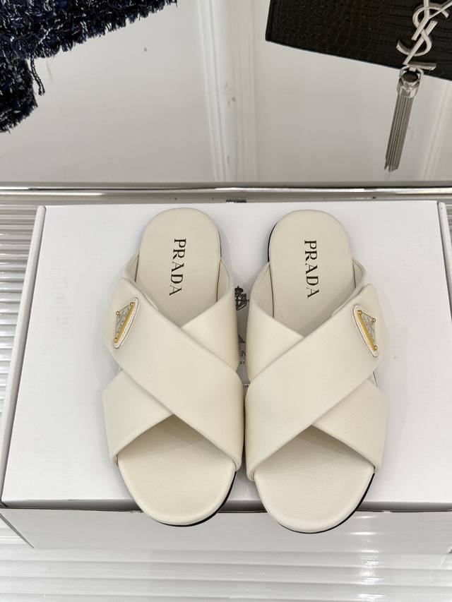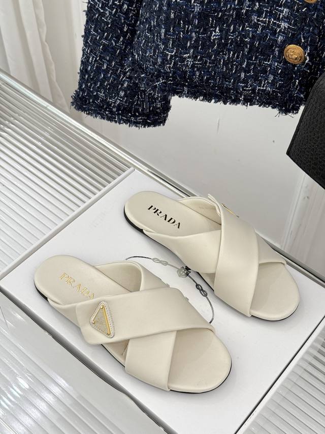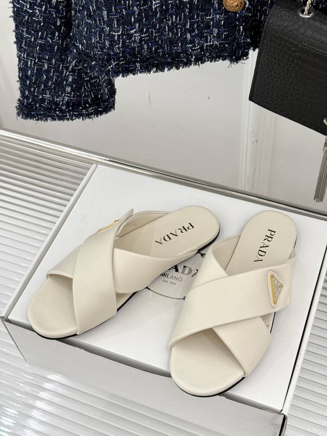 / 厂价 加飞机盒10 prada 普拉达经典春夏新品 三角标交叉拖鞋 夏天最值得入手的简约单品 自带高级气场的拖鞋 也非常容易驾驭非常舒适好穿! Go 材质: 鞋