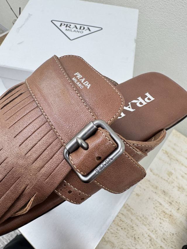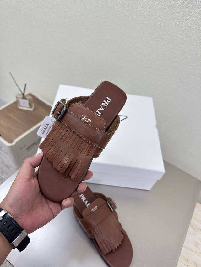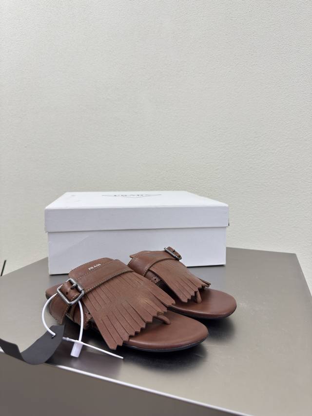 复古流苏做旧 夹趾拖鞋 Prada 棕色 平底设计 简约设计 搭配三角标 Logo 的设计和简约的线条 很有格调 简单纯粹得色调 原版开模 舒适炸街 原版 打蜡
