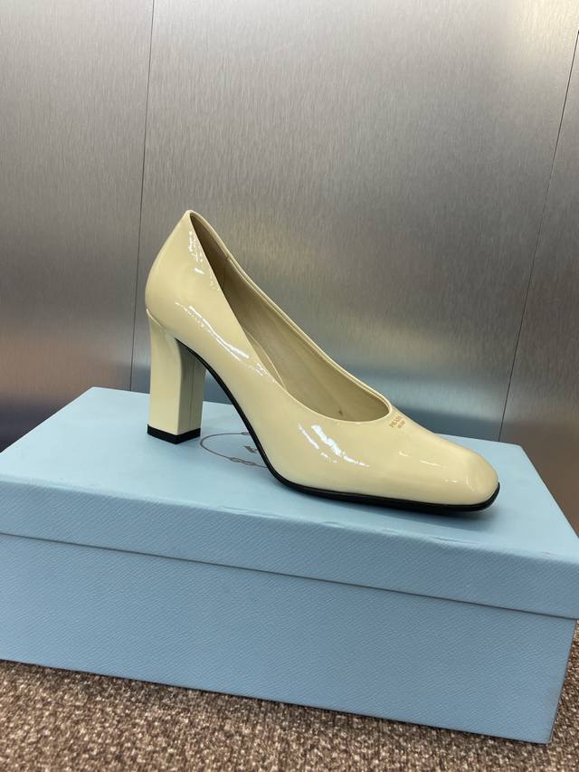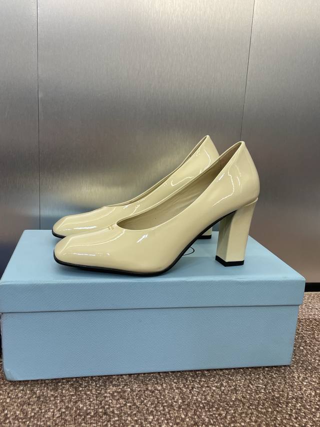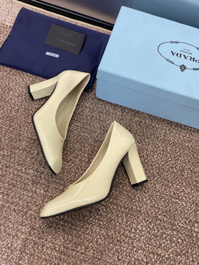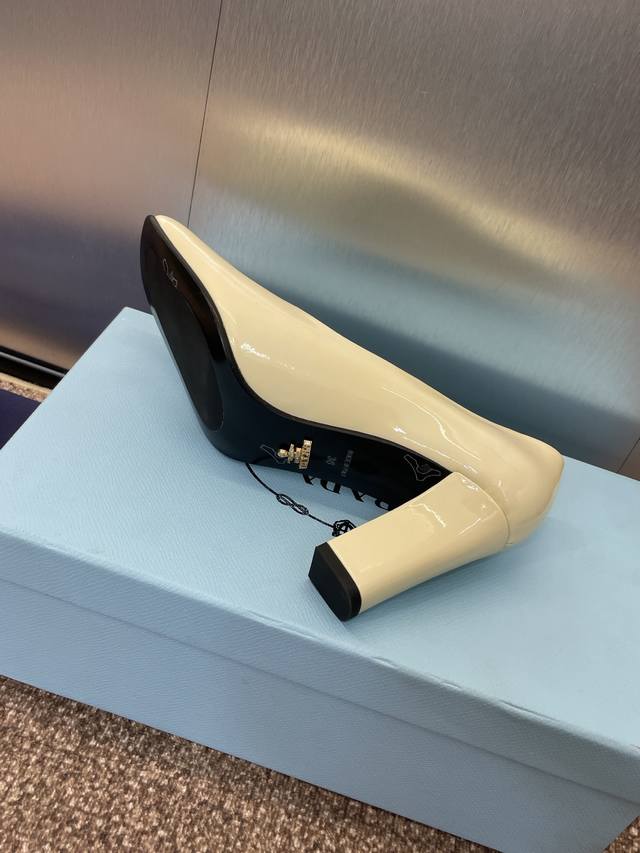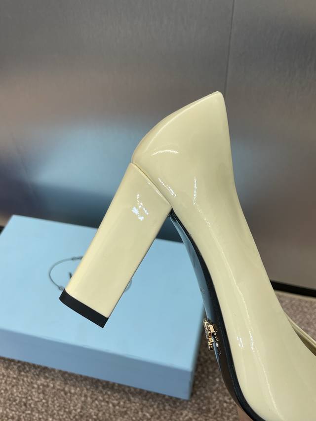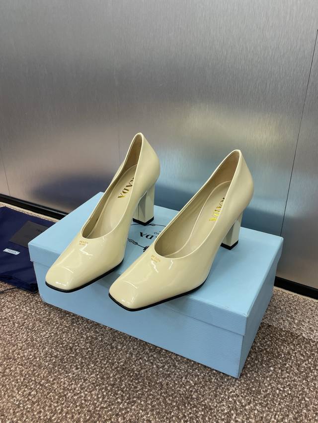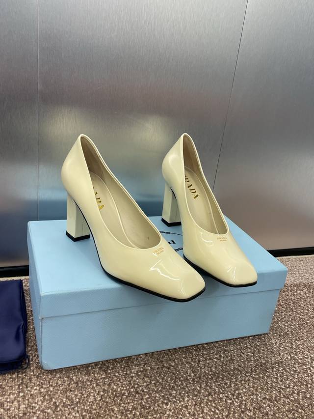 / 工厂价 PRADA 2025春夏新款方头高跟女鞋 普拉达粗跟果冻色时尚百搭单鞋 材质:鞋面进口牛漆皮+水染羊皮内里+意大利注塑真皮大底跟高:8.5CMSize: