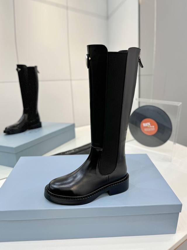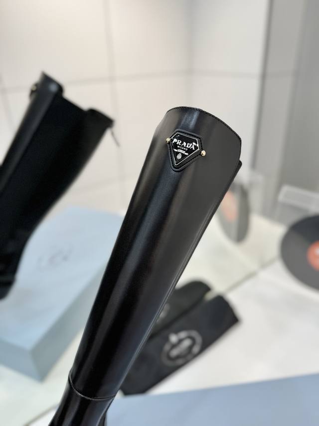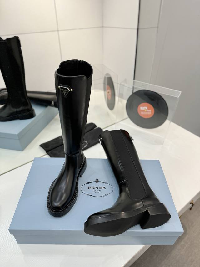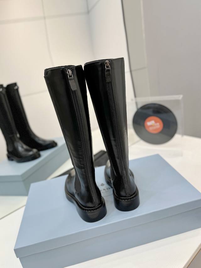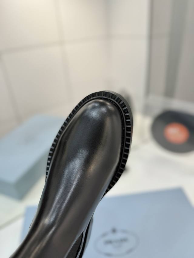 工厂p价 普拉达短靴 秋冬新款prada普拉达三角钻形扣短筒切尔西 这款鞋履配有鲜明的圆形鞋头,橡胶厚底为经典乐福鞋注入现代外观,涂珐琅金属徽标装饰彰显品牌格调