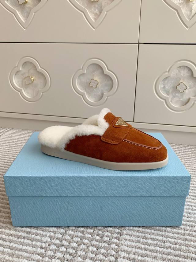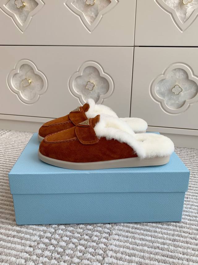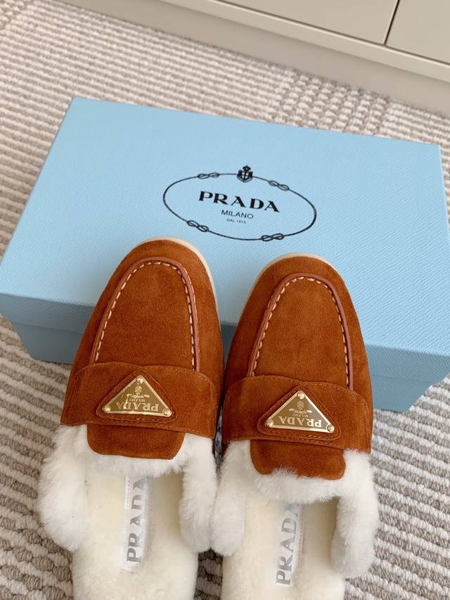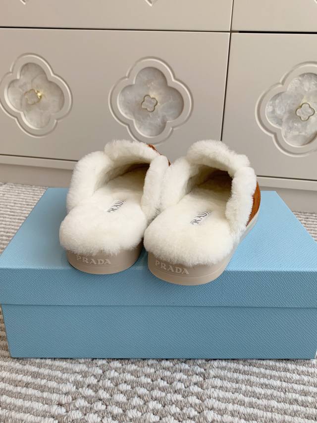 / 批拖鞋 乐福 情侣款 prada 普拉达 新品三角标秋冬厚底穆勒包头拖鞋 毛毛乐福鞋 材质与工艺: 进口羊京面 原版定制进口羊皮毛一体 170%真羊毛 保暖神器
