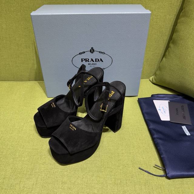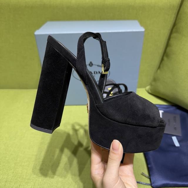 / 新色prada 普拉达2025Ss秋季新品 Saffiano高跟厚底绒面皮凉鞋,秉承现代设计理念,绽现精致魅力。 织物的新雅色彩平添明艳格调。标志性三角形徽标彰