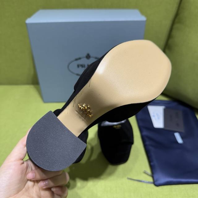 新色prada 普拉达2025Ss秋季新品 Saffiano高跟厚底绒面皮凉鞋,秉承现代设计理念,绽现精致魅力。 织物的新雅色彩平添明艳格调。标志性三角形徽标彰