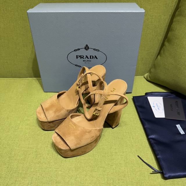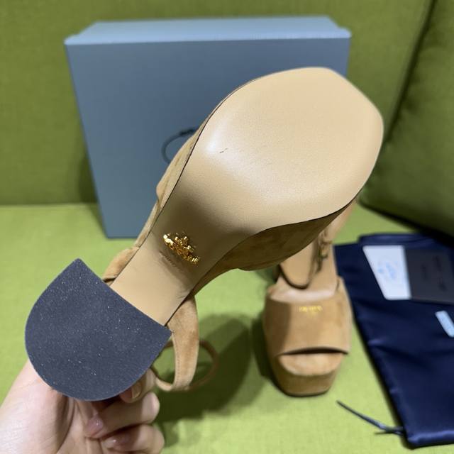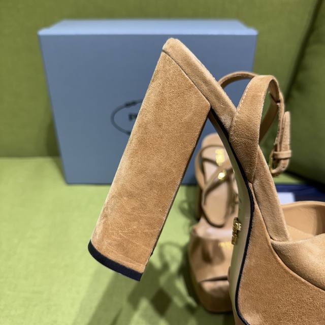 / 新色prada 普拉达2025Ss秋季新品 Saffiano高跟厚底绒面皮凉鞋,秉承现代设计理念,绽现精致魅力。 织物的新雅色彩平添明艳格调。标志性三角形徽标彰