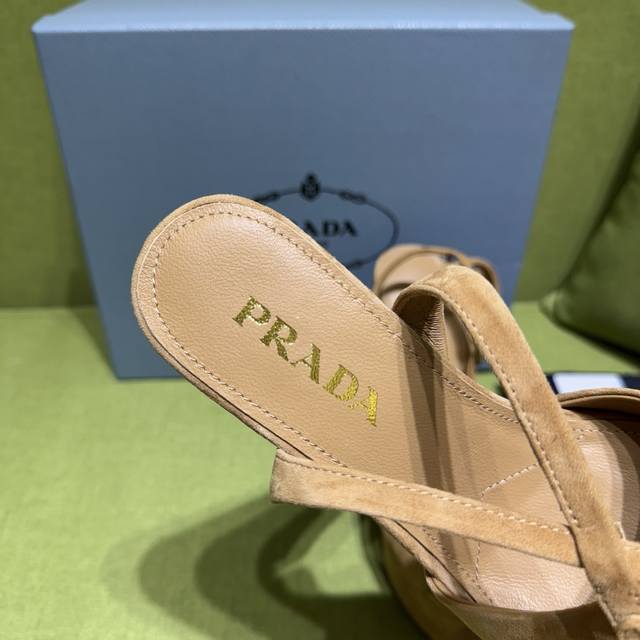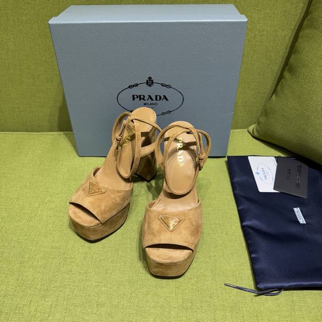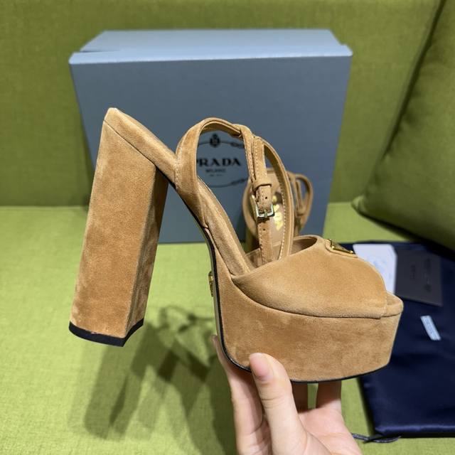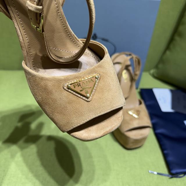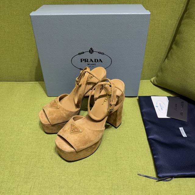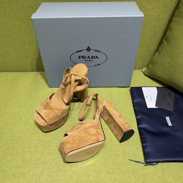 / 新色prada 普拉达2025Ss秋季新品 Saffiano高跟厚底绒面皮凉鞋,秉承现代设计理念,绽现精致魅力。 织物的新雅色彩平添明艳格调。标志性三角形徽标彰