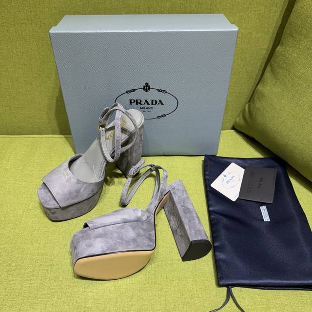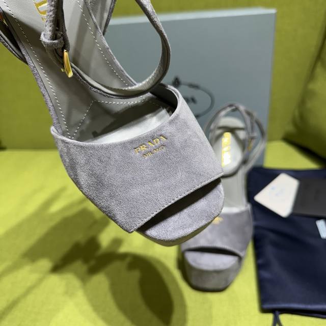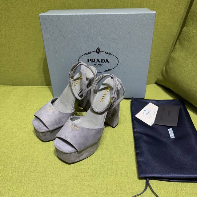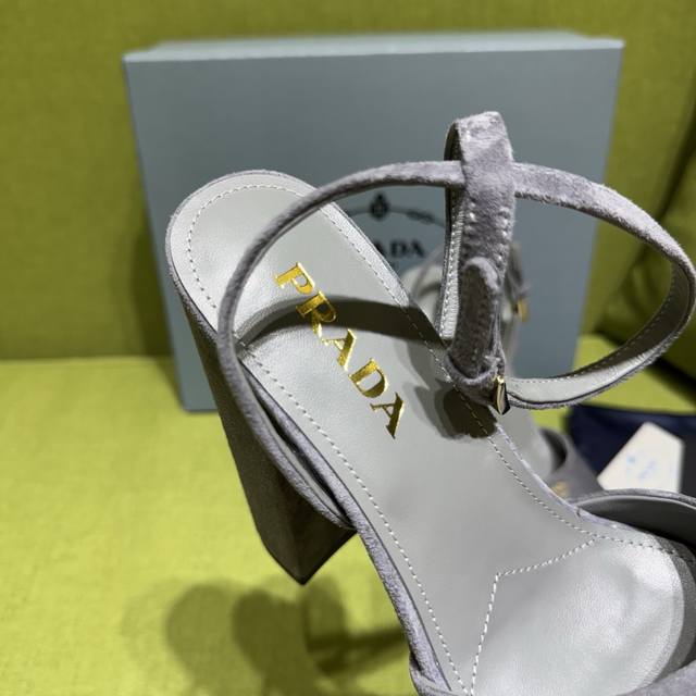 / 新色prada 普拉达2025Ss秋季新品 Saffiano高跟厚底绒面皮凉鞋,秉承现代设计理念,绽现精致魅力。 织物的新雅色彩平添明艳格调。标志性三角形徽标彰