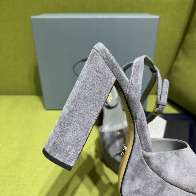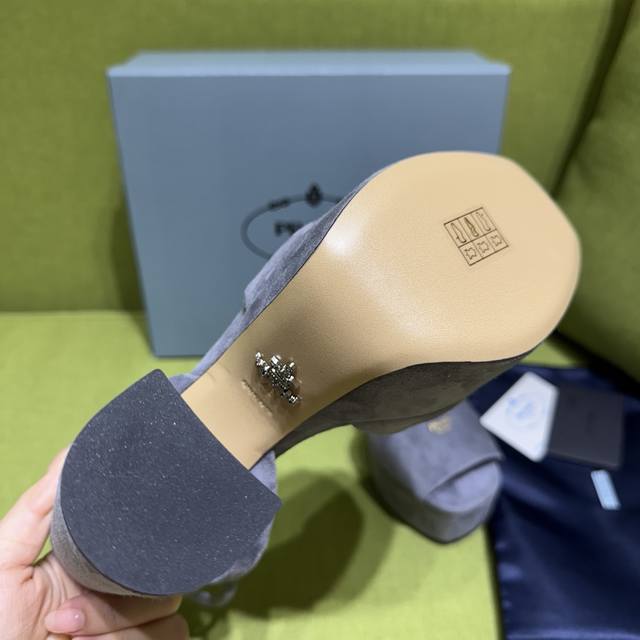 新色prada 普拉达2025Ss秋季新品 Saffiano高跟厚底绒面皮凉鞋,秉承现代设计理念,绽现精致魅力。 织物的新雅色彩平添明艳格调。标志性三角形徽标彰