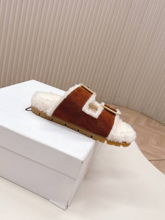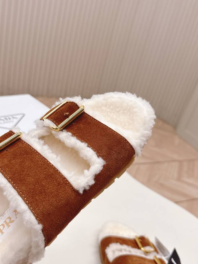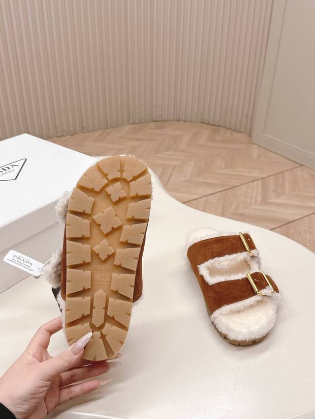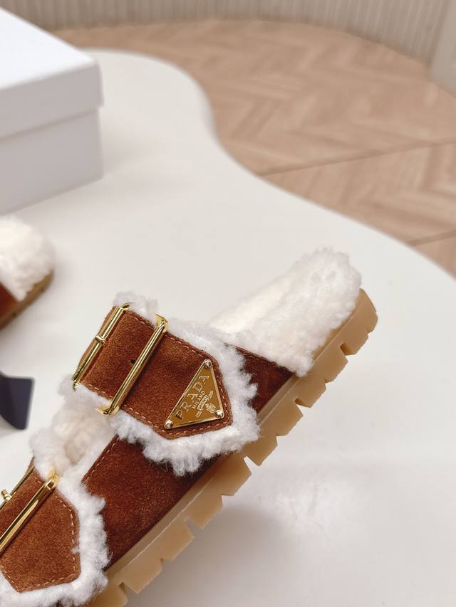 / 新颜色系列! 短靴款 高帮款 低帮款 拖鞋款!!prada 普拉达 三角标羊毛鞋,厚底靴 雪地靴 半拖鞋系!高级牛绒真羊羔毛 真皮沿条 双色Tpu大底 材质细节