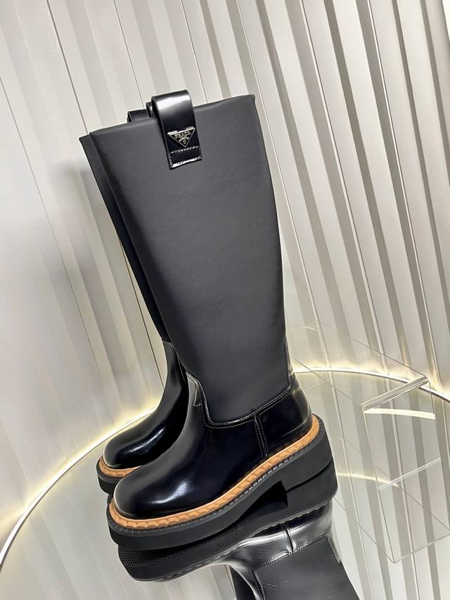/ 普拉达三角标双沿条锯齿厚底系带及踝靴侧拉链马丁靴机车风短靴 这款皮革短靴融入三角标细节,风格百搭,橡胶鞋底坚实而轻盈,彰显运动风尚与实用性。惯用于精美鞋履的复古