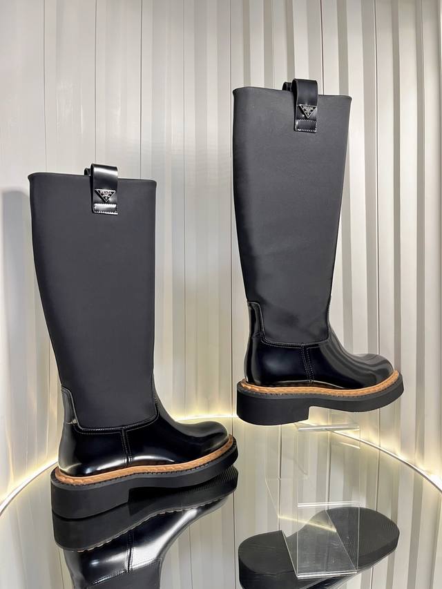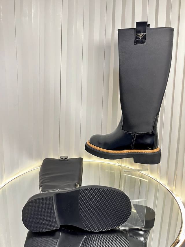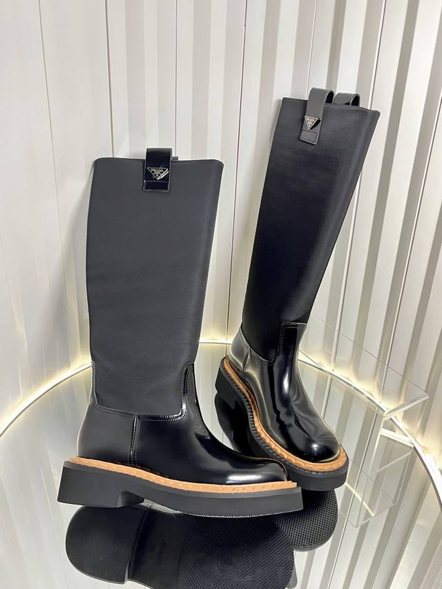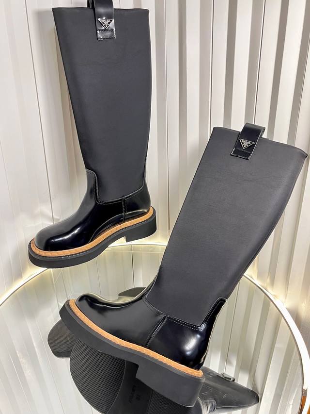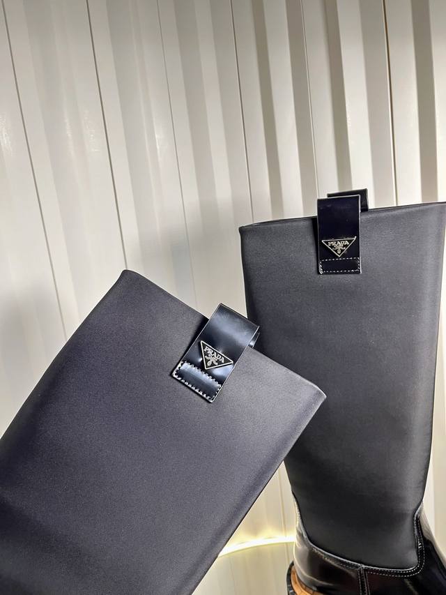 25Ss秋冬新款Prada三角标双沿条锯齿厚底系带短靴侧拉链马丁靴...