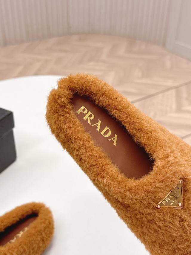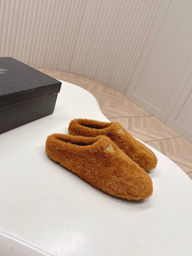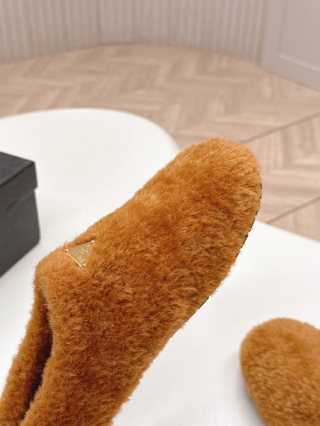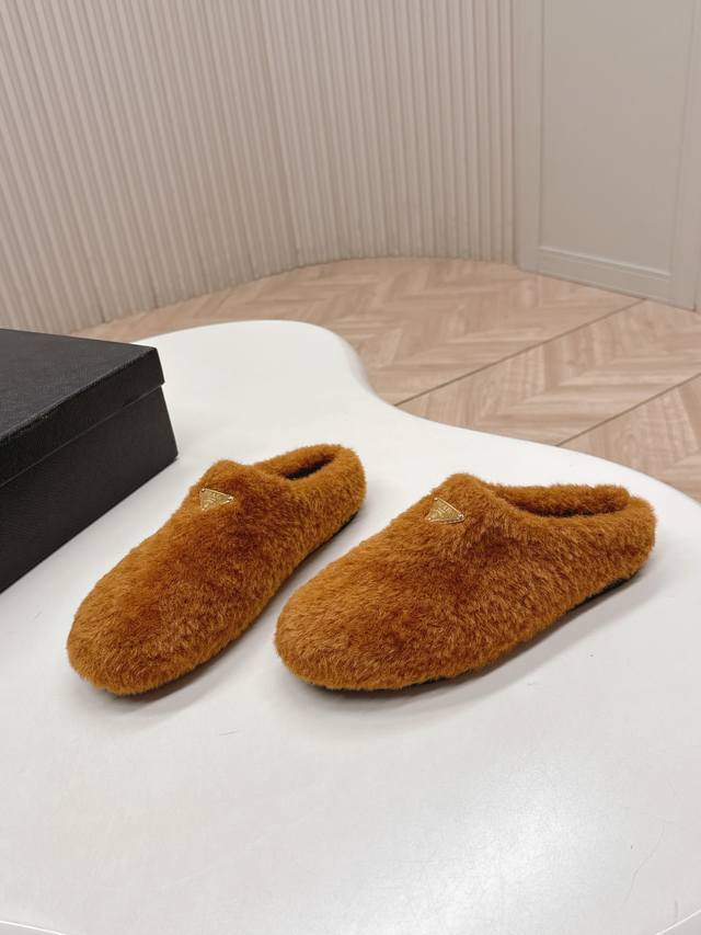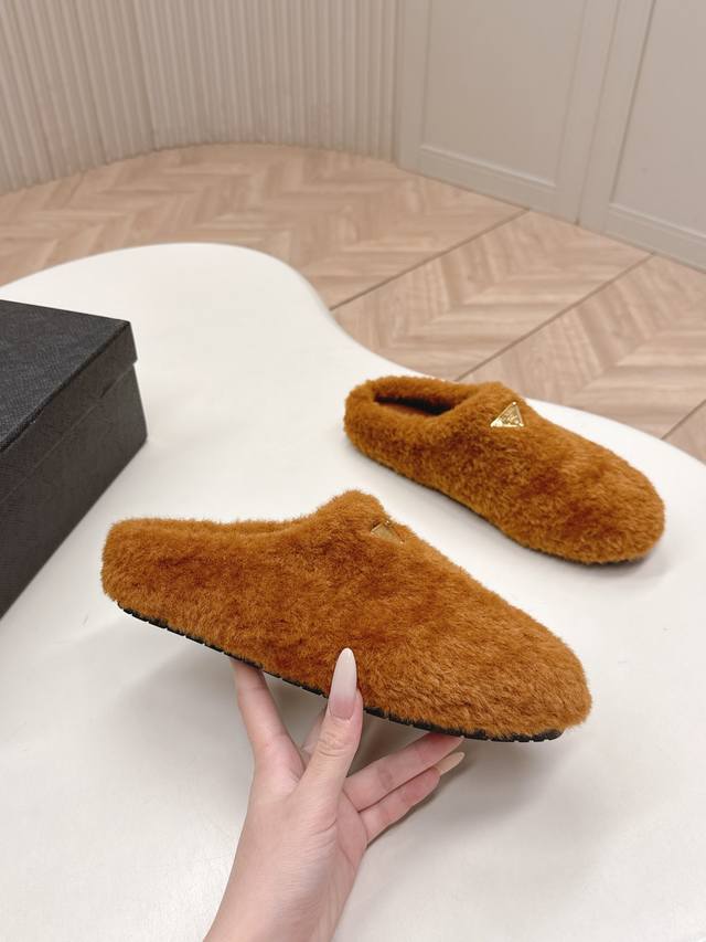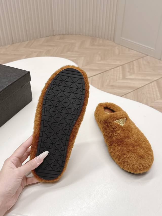 普拉达 prada25秋冬毛毛拖鞋系列 半拖羊毛拖鞋 经典三角扣 舒适 萌萌哒 可爱 时尚 高雅 百搭 ,羊毛舒适柔软,唤醒秋冬暖意。让您从早到晚舒适踱步。搭配