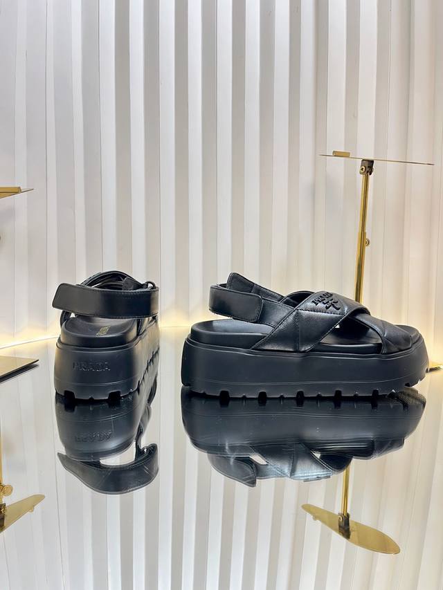 最新系列 Prad* 普拉达25款 厚底魔术贴凉鞋 拖鞋罗马厚底魔术贴凉鞋 最新走秀款,经典升级 舒适度与时髦度并存 每个颜色搭配都好看,设计搭配不同风格需求