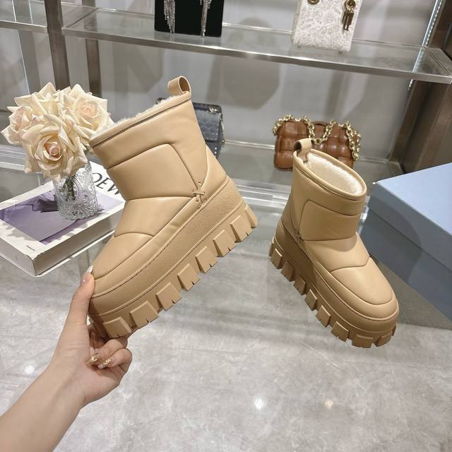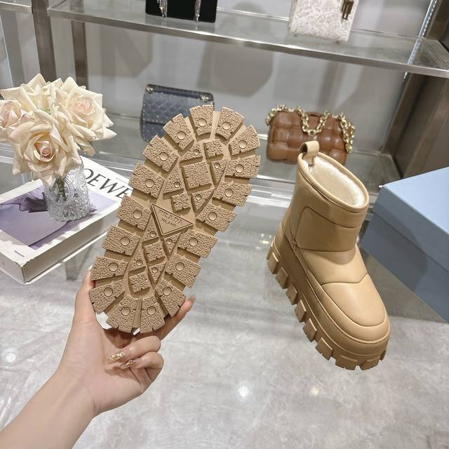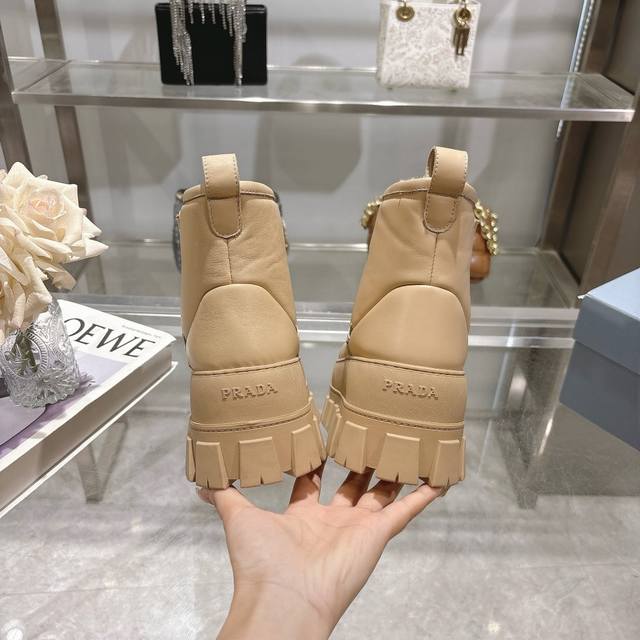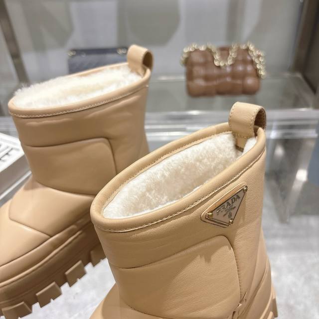 / 最新Prada普拉达:新奇别致的柔软牛皮面,纯羊毛里,独特的设计的风格,为此款复古风雪地靴注入心裁别出的设计巧思 4.5厘米橡胶鞋底 涂珐琅金属配件 凹凸鞋底花