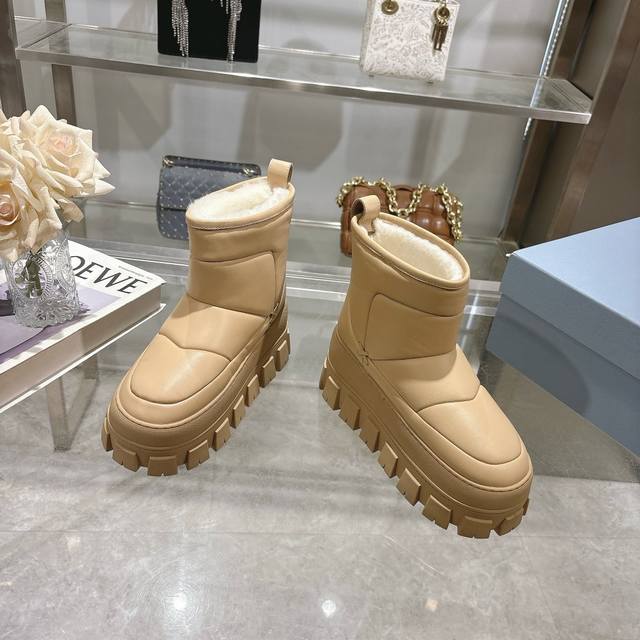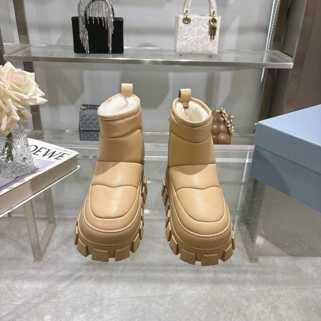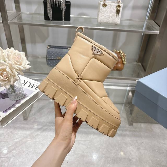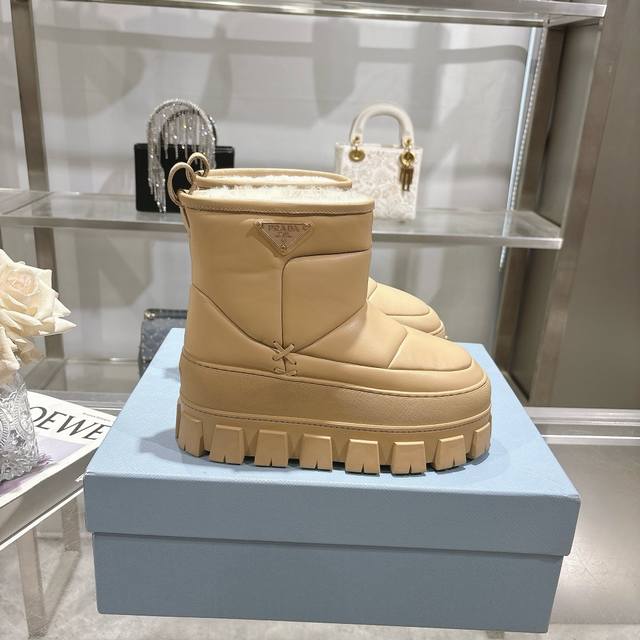 最新Prada普拉达:新奇别致的柔软牛皮面,纯羊毛里,独特的设计的风格,为此款复古风雪地靴注入心裁别出的设计巧思